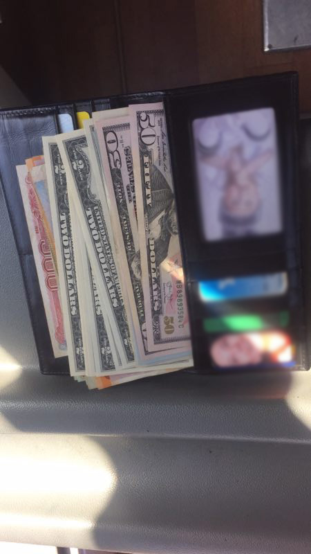经了解,这名粗心的乘客是早上从新浦总站乘坐6:30到徐州高铁站准备出差的,车在9:10左右到达徐州高铁站后因着急下车,结果不慎将钱包落在了座位上。路奎师傅在乘客下完车后进行日常清理打扫工作,当打扫到6号座位的时候,在上面发现了一只黑色的钱包。打开后看到包里不仅有大量人民币,还有大量的外币和身份证、银行卡等,因为没有失主的联系方式,路奎师傅在着急的同时只好拨打110电话,希望110帮忙协助找到失主。在10点左右车站派出所民警带着失主找到了路奎师傅。