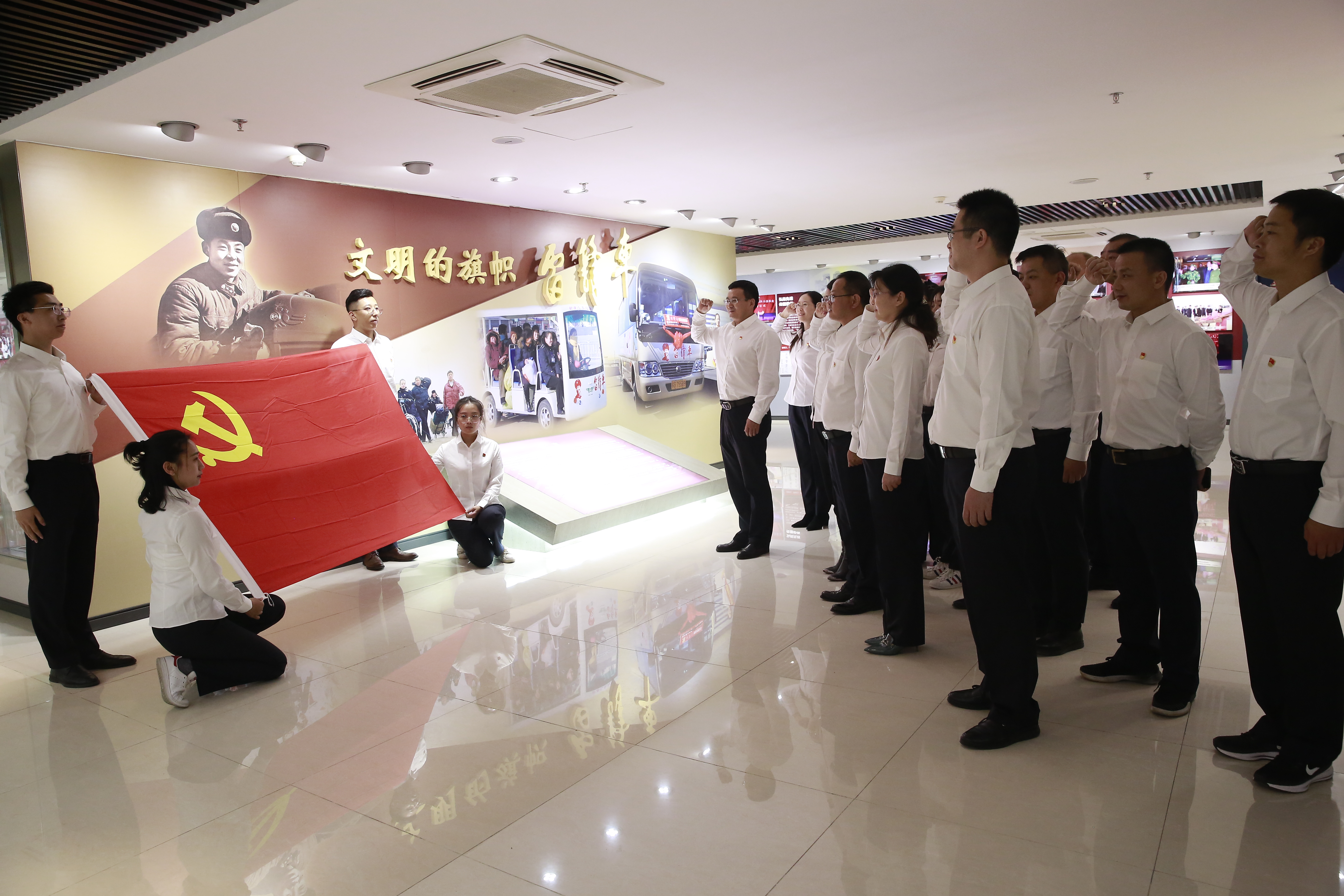 随后,交通集团党员干部前往连云港市雷锋车纪念馆参观学习。在雷锋车事迹陈列馆里,大家认真聆听讲解员的介绍,边走边听,通过实物、图片、雕塑、场景详细了解到几代“雷锋车”手“宁愿自己千般苦,不远旅客一时难”的先进事迹。参观结束后,党支部、董事长吴心航带领全体党员干部重温入党誓词,全体党员面对鲜红的党旗,郑重举起右手,再一次向党做出庄严的承诺,重忆当年的坚定信念和入党初心,汲取澎湃的进取激情和为党奋斗的精神力量。