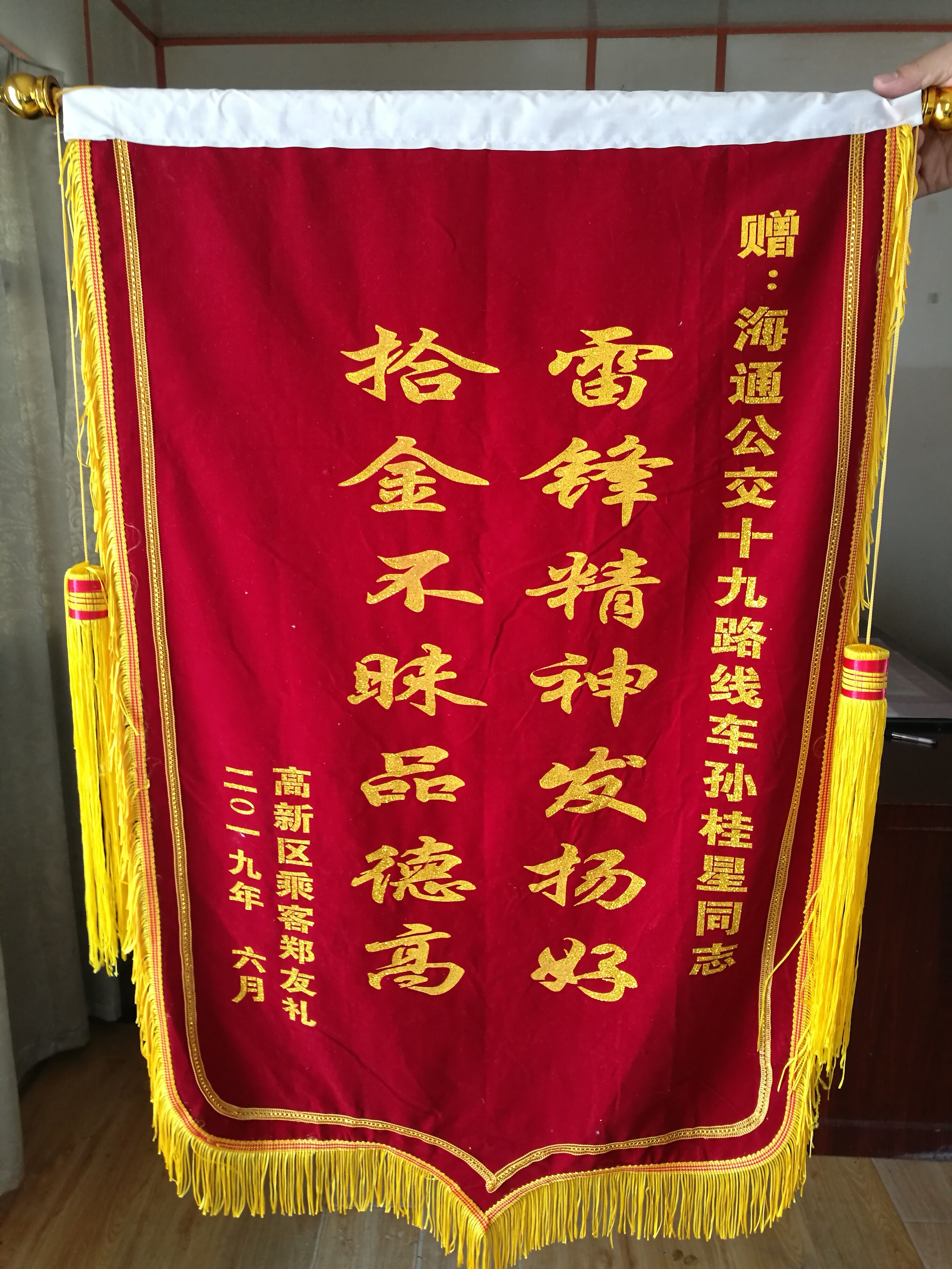 当日下午,郑先生来到公交集团公交事业一部江化北路公交停车场办公室,经核实无误后顺利取回钱包。为表谢意,郑先生于6月18日送来一面印有“雷锋精神发扬好,拾金不昧品德高”字样的锦旗,表达他对驾驶员孙桂星师傅的感谢之情。