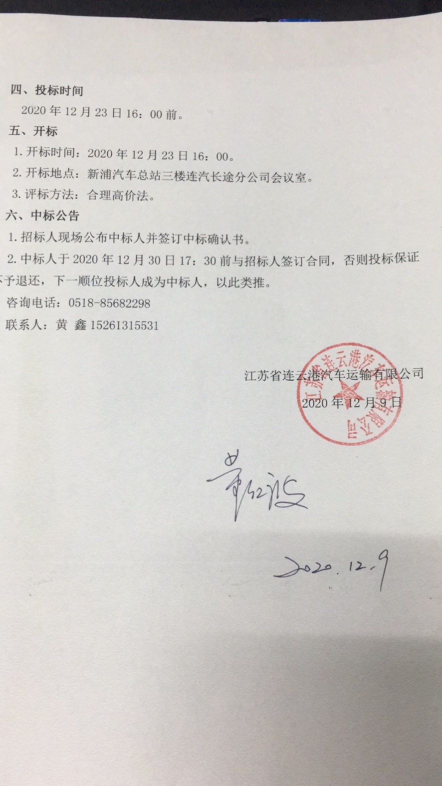 江苏省连云港汽车运输有限公司长途分公司现有连云港市区至威海班线,拟实行客运班次承包经营考核模式,现对此项目公开招标客运班次承包经营责任人。有意者请充分调研后于2020年12月16日17:30前到连汽长途分公司咨询、报名。
