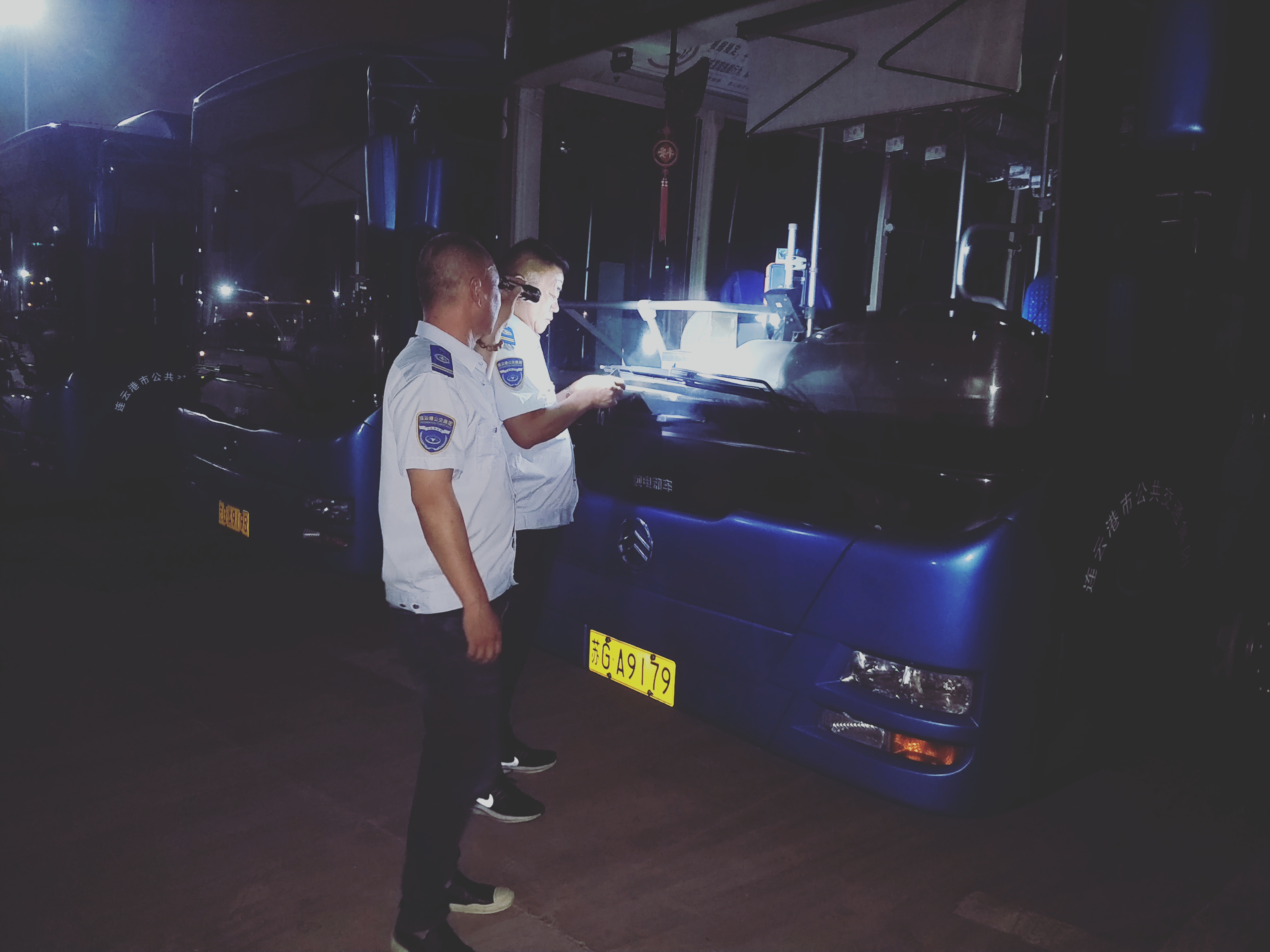 公交集团公交事业一部组织分公司管理人员对江化路停车场的车辆进行了夜间检查,检查重内容有五项:一是所有车辆是否按指定位置停放,在车位处是否占压消防通道。二是车辆是否关闭总电源及气阀。三是车辆外观卫生是否达标,车身车容车貌是否有明显碰刮的痕迹。四是门窗、边盖是否上锁及关闭。五是场站消防设施、安全设备是否齐全有效。工作人员对查出的问题车辆做好台账登记,能够当场整改的现场整改到位,不能现场整改的两日内整改完毕,并做好跟踪管理。