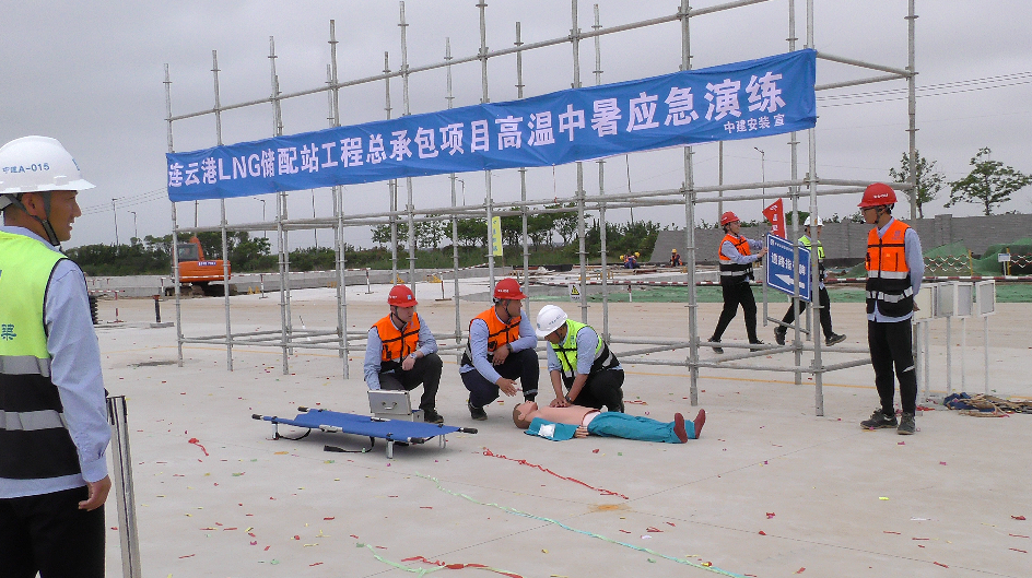 启动仪式上,一场高温中暑演练拉开序幕,场景设置在施工现场2万立方米LNG低温罐处。高温炎热天气下,一名焊工正进行高处焊接作业,中暑后不慎坠落至地面,导致伤害。接到报告后,项目经理立即启动高温中暑事故应急预案,组织协调应急处置和救援行动。疏散警戒组、应急抢险组、医疗救护组、后勤保障组、通讯保障组各司其职,配合密切,高效完成了现场的警戒疏散及伤患救援等行动。