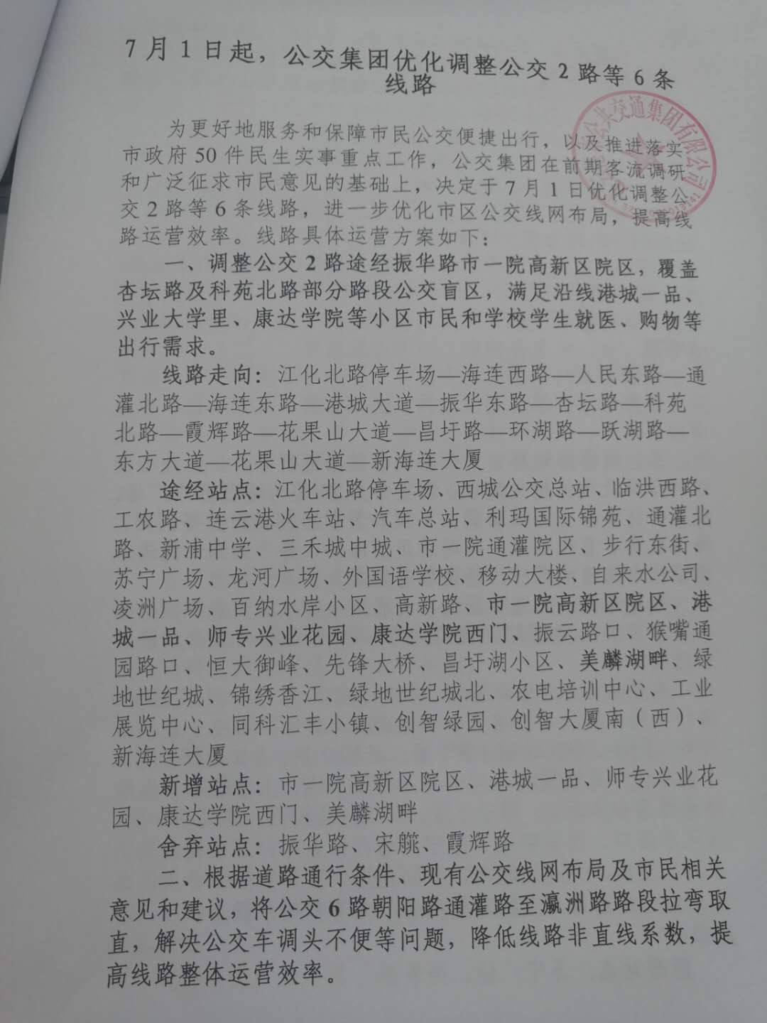为更好地服务和保障市民公交便捷出行,推进落实市政府50件民生实事重点工作,公交集团在前期客流调研和广泛征求市民意见的基础上,决定于7月1日优化调整公交2路等6条线路,进一步优化市区公交线网布局,提高线路运营效率。线路具体运营方案如下: