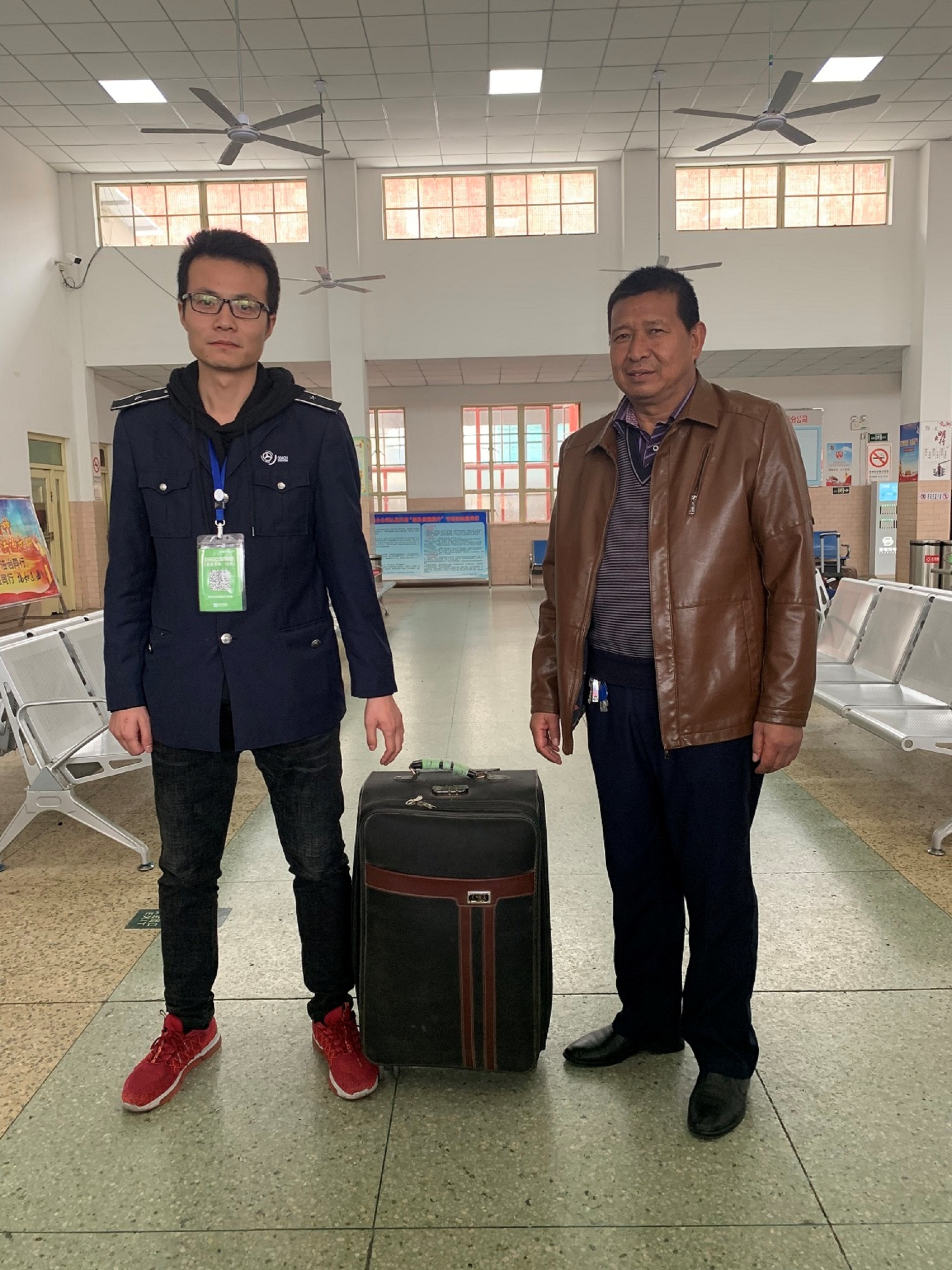 10月24日下午9:00时左右,正值乘车高峰,东海分公司站务员穆乐当班期间发现在候车大厅座椅上有一个黑色的行李箱。他想着可能是刚才检过票的昆山方向的乘客遗落的,于是立即拿起包到将要发车的昆山班寻找失主,结果没有找到,他便将包上交值班站长保管,等待旅客来认领。