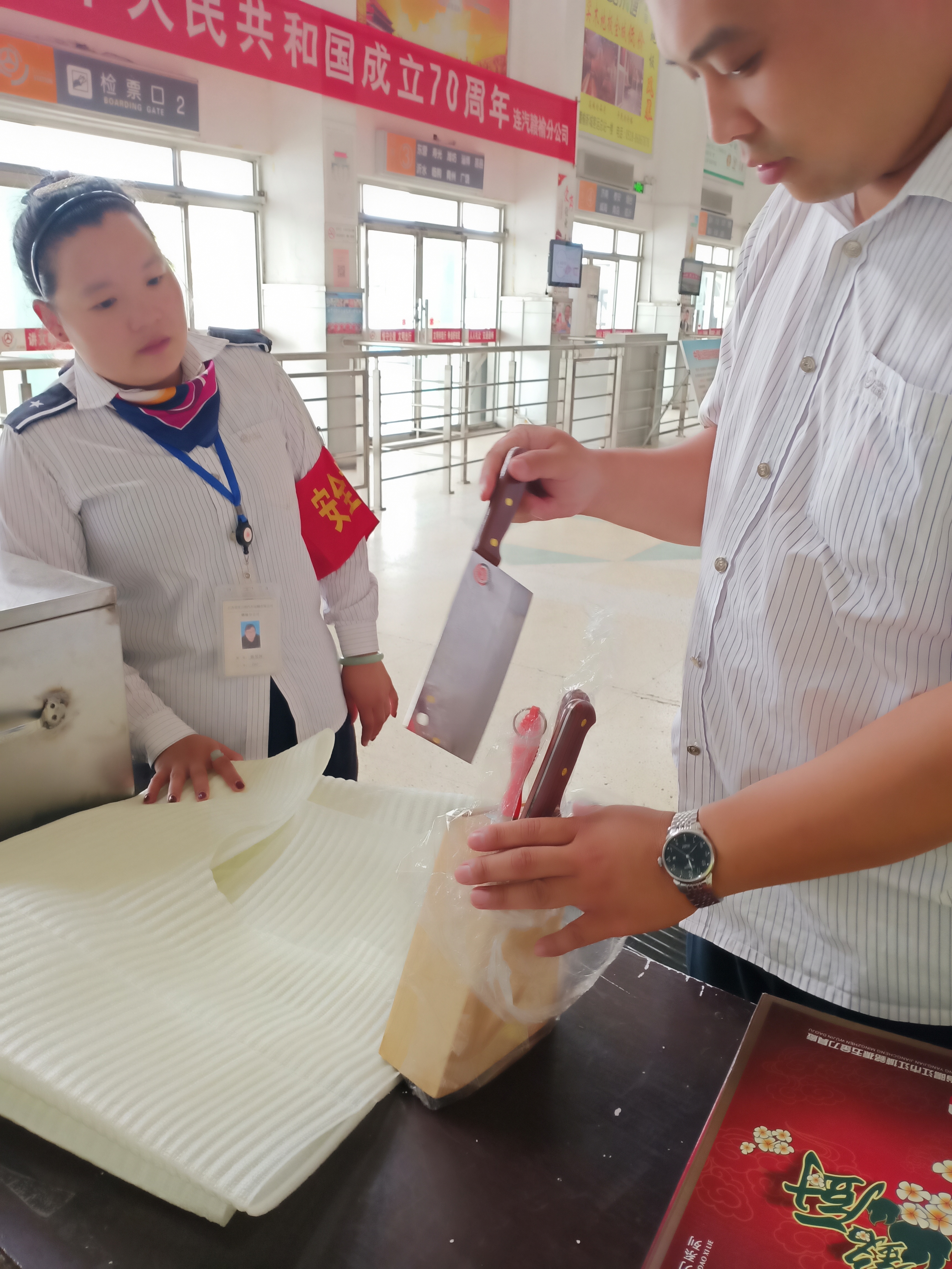 9月17日上午,安检员庄玲当班期间发现一名旅客携带的物品在安检仪上呈现蓝色影像,她凭着多年的安检经验,察觉到情况可疑。于是,告知旅客需到安检处置处进行开包确认。当班安检班长李寿东对其行包进行了查验,果然,在旅客包内查到一套刀具4把及52度以上的高度白酒一桶。李寿东当场告知旅客张某不能携带危险品乘车,值班民警也对旅客进行了安全教育。随后,将查处到的危险品进行了登记保管,并告知可由亲友帮忙带回。