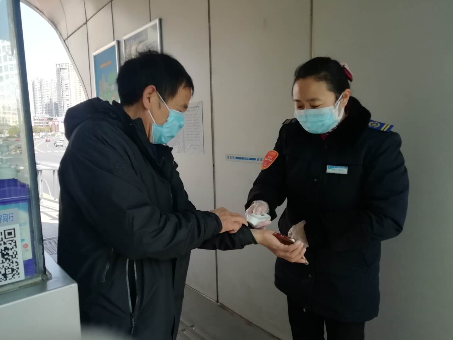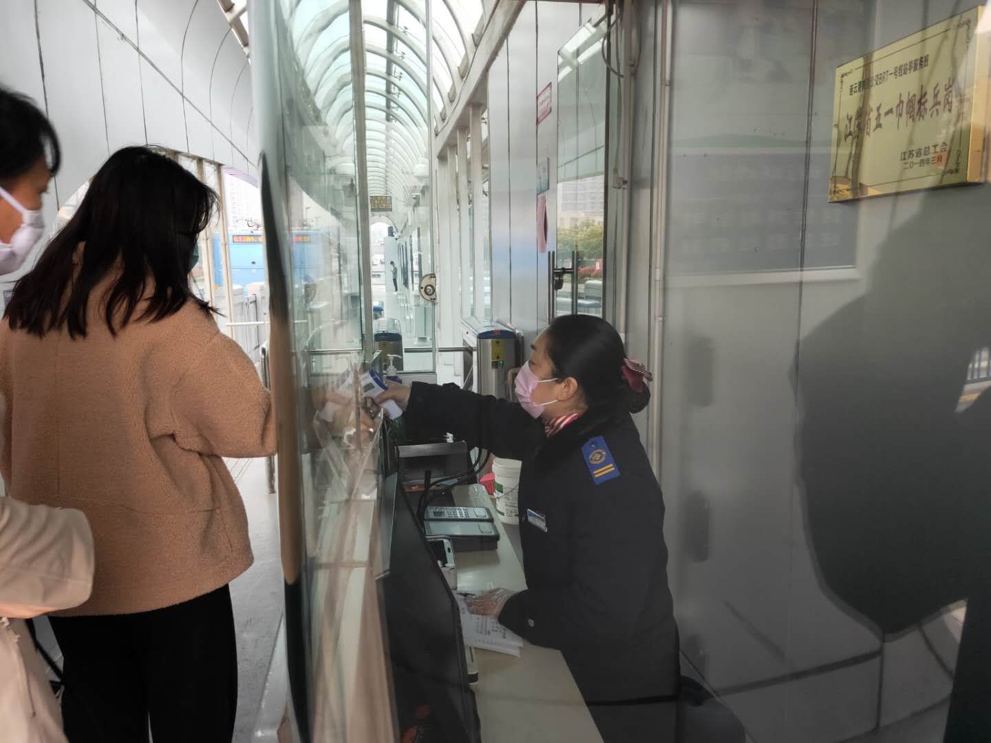 4月11日上午6点多,站务员葛粉娣正在票房外忙碌着:测量进站乘客的体温、查看乘客的健康码,这时一位拉着行李箱的中年乘客着急向她求助。