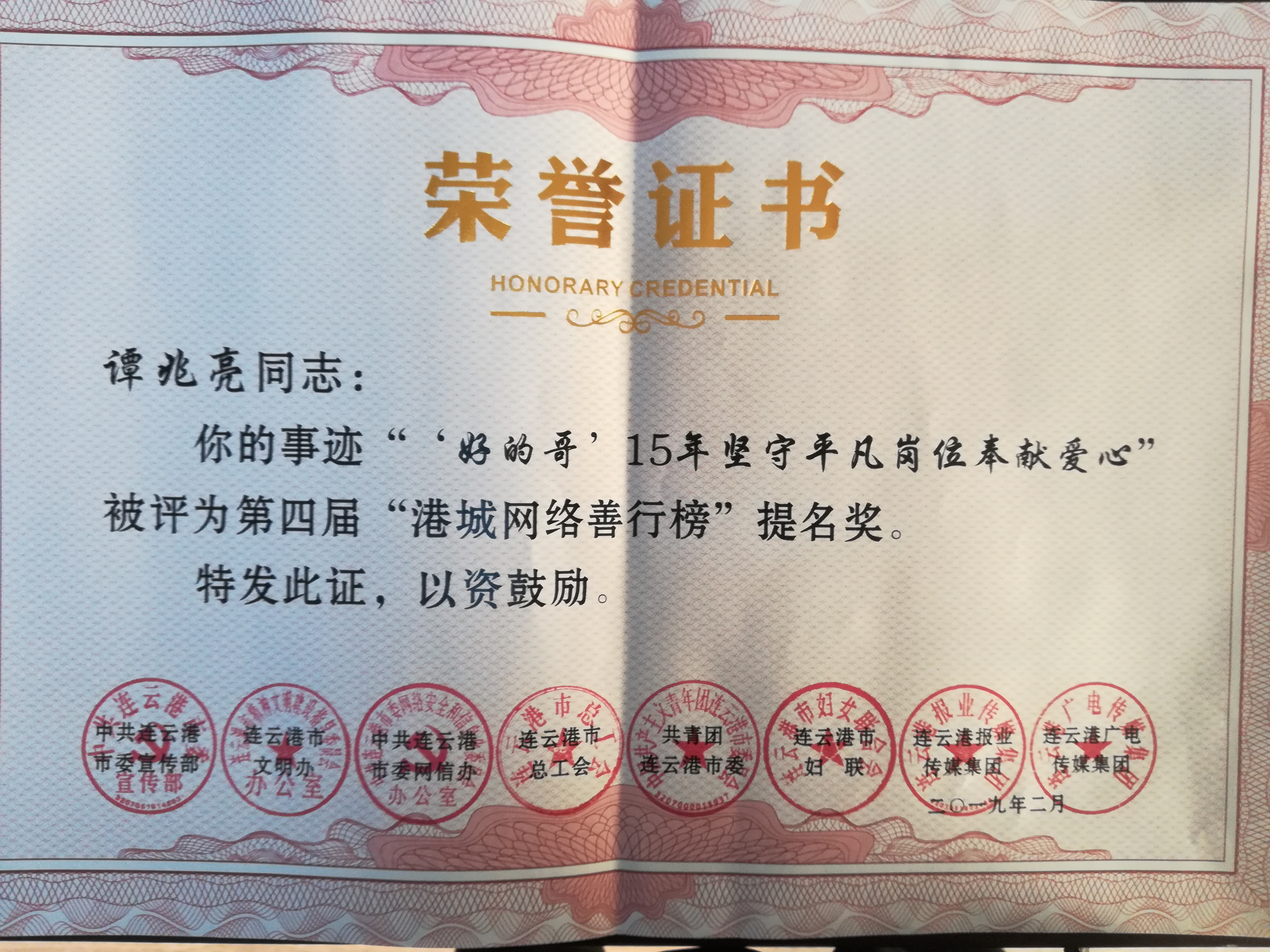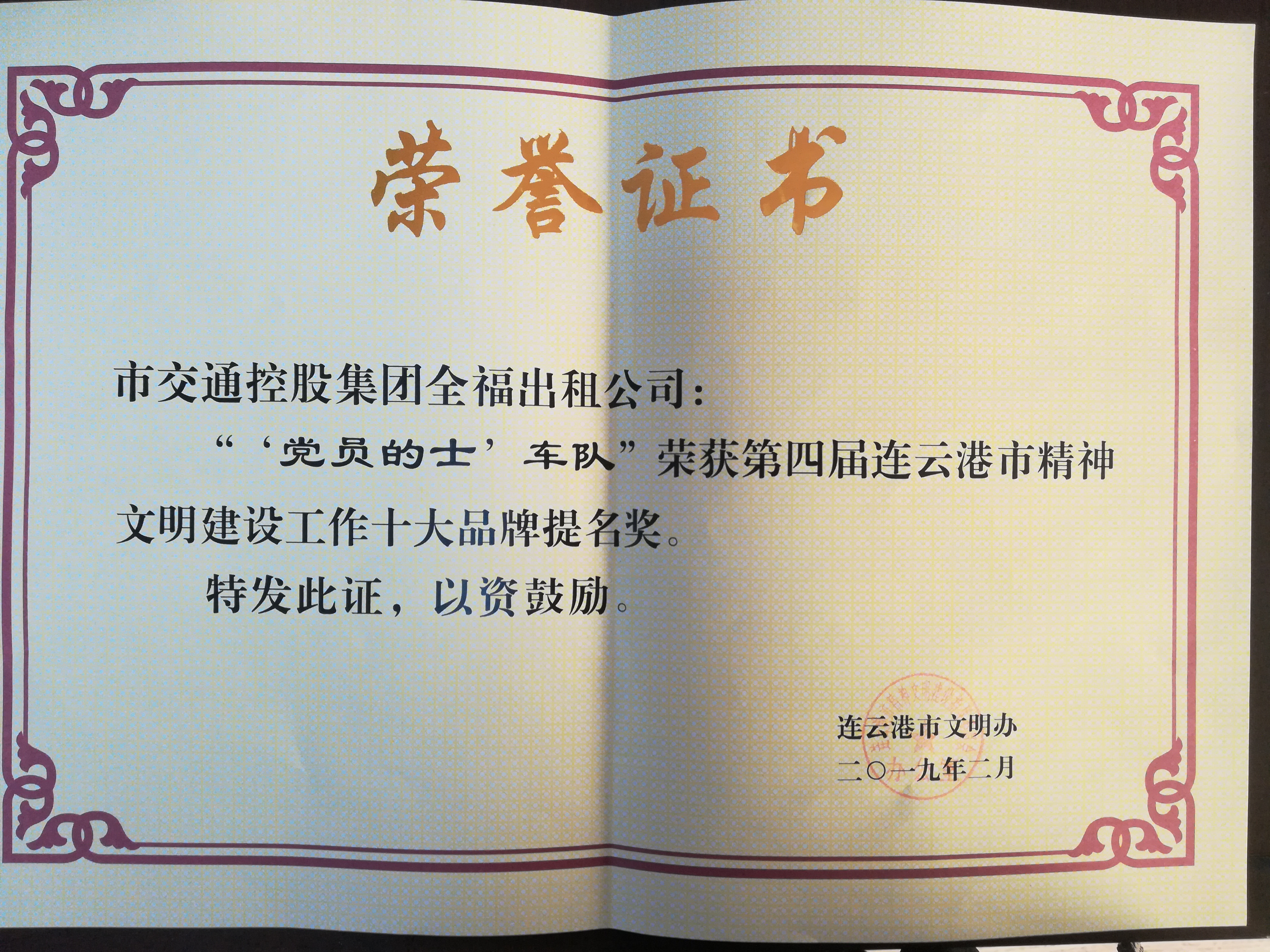 会议现场,还对第四届连云港市精神文明建设工作十大品牌、第四届“港城网络善行榜”十大上榜人物(事件)和优秀组织奖、2019年连云港市精神文明建设工作“金点子”方案进行了表彰。全福公司“党员的士”车队喜获第四届连云港市精神文明建设工作十大品牌提名奖。公司“党员的士”队员谭兆亮同志以“‘好的哥’15年坚守平凡岗位奉献爱心”先进事迹荣获第四届“港城网络善行榜”提名奖。
