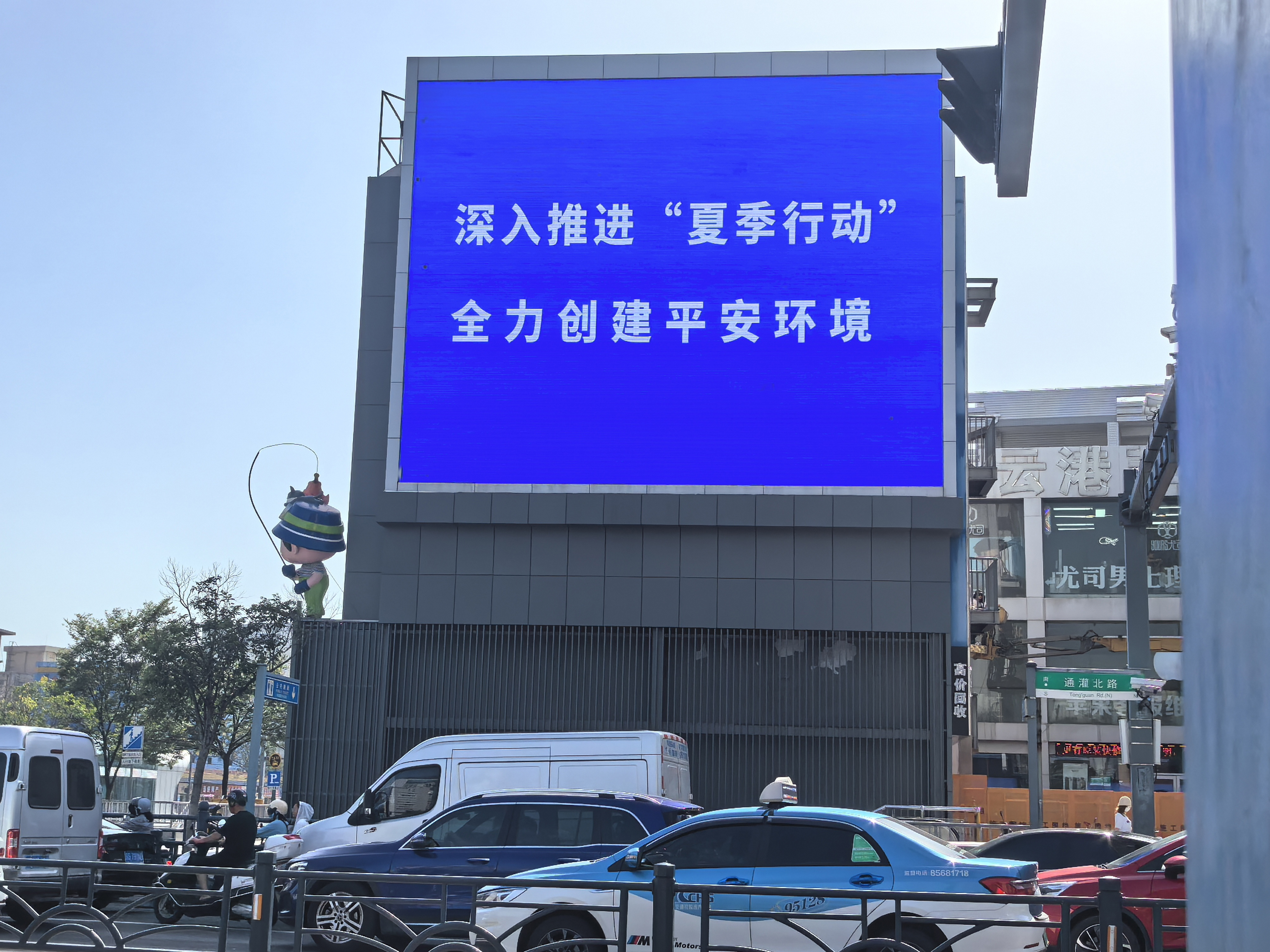 交通集团作为国有企业,具备海量优质宣传资源优势的同时,积极配合市公安相关部门下达的工作,开展此次“夏季行动”公益推广,在我市核心地段海鸥广场东侧LED彩色大屏上刊了主题系列宣传标语。本次广告宣传的主要内容有:“筑牢夏夜‘防护墙’,当好平安‘守夜人’”、“打击犯罪零容忍,破案攻坚护平安”、“深入推进‘夏夜行动’,全力创建平安环境”等。