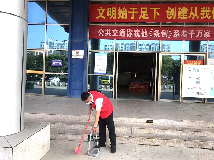 在灌云客运站内,“红马甲”志愿者对客运站场和站外广场进行了深入清理。大家干劲十足,团结协作,充分发挥不怕脏、不怕累的劳动精神。清洁卫生死角,擦拭服务台、检票台面,清扫售票大厅地面和吸烟亭等重点区域。虽然天气炎热、汗水浸湿了衣服,但是志愿者们的做事热情一点不减,坚持埋头苦干,丝毫没有偷懒懈怠。通过两个小时的清理,灌云客运站站貌焕然一新。