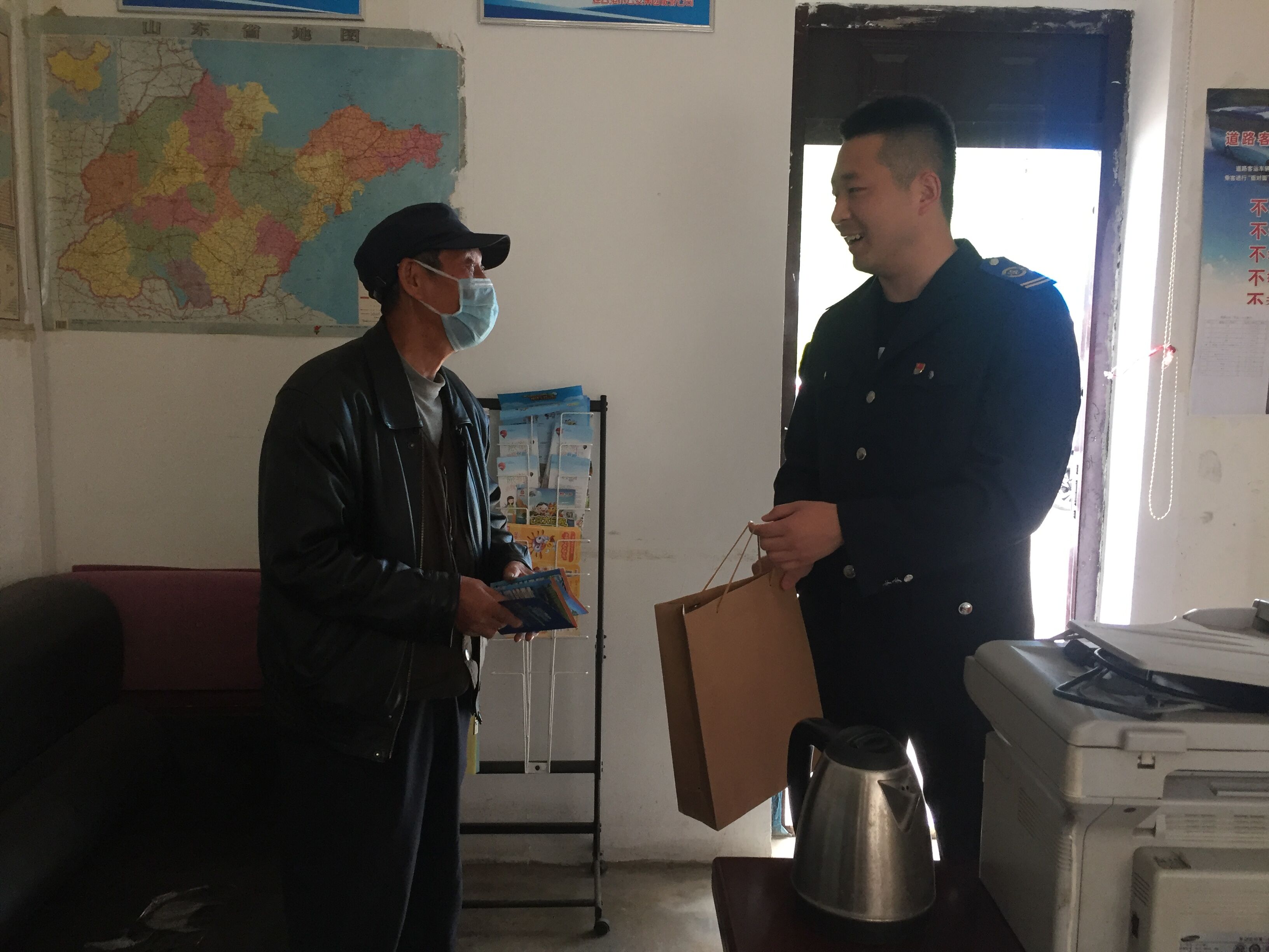 4月26日上午,王先生来到公交集团经营发展事业部旅游分公司车队办公室领取手提袋并对驾驶员李晋师傅助人为乐表示感谢。
