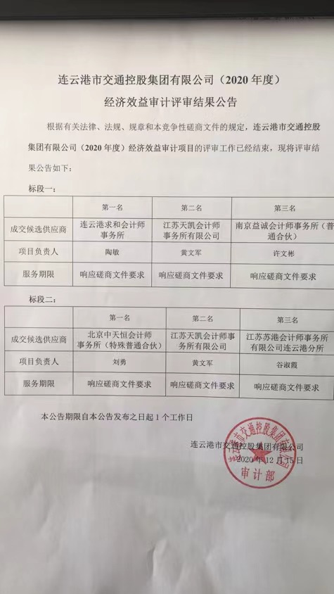 根据有关法律、法规、规章和本竞争性磋商文件的规定,连云港市交通控股集团有限公司(2020年度)经济效益审计项目的评审工作已经结束,现将评审结果公告如下: