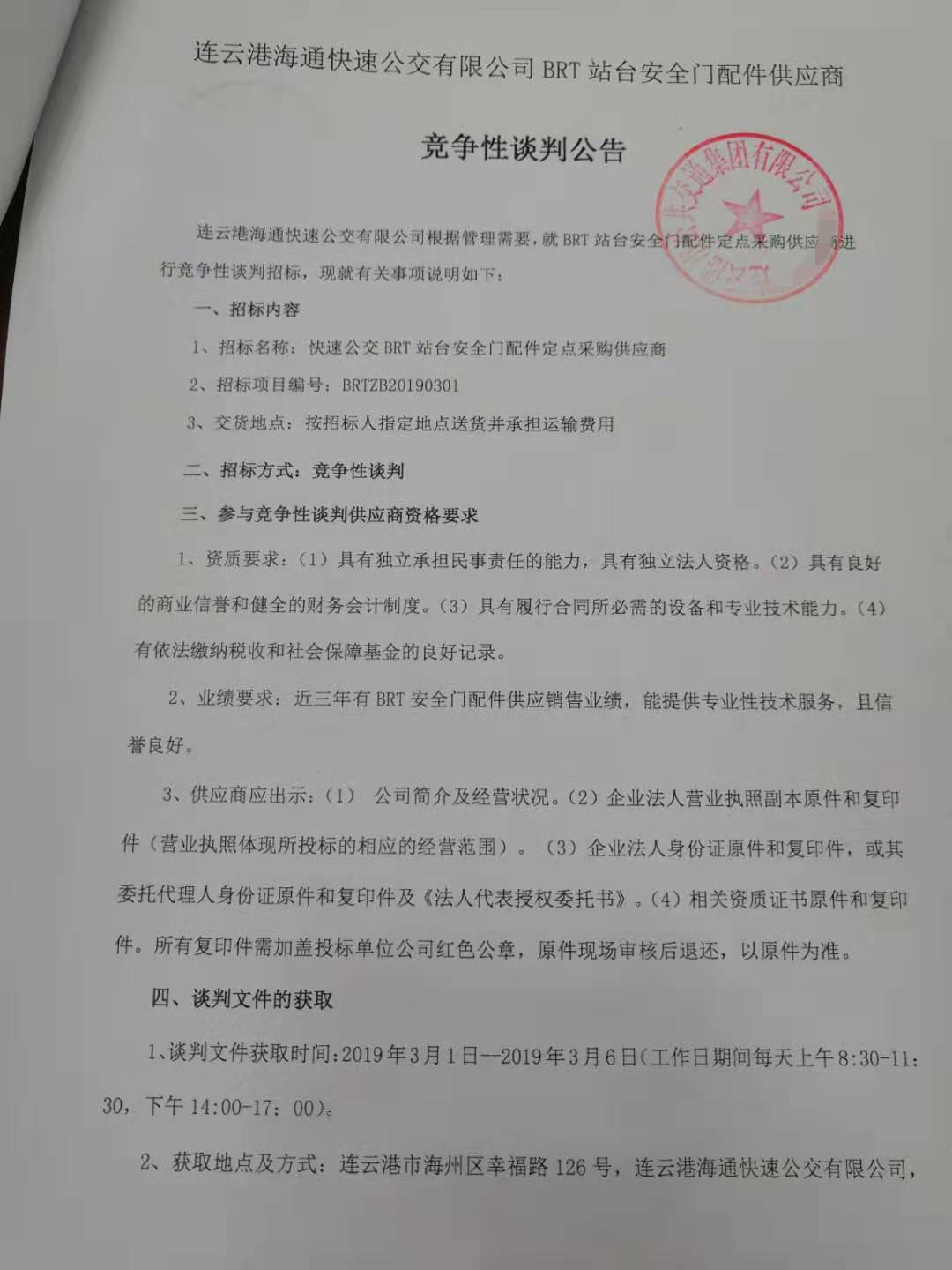 连云港海通快速公交有限公司根据管理需要,就BRT站台安全门配件定点采购供应商进行竞争性谈判招标,现就有关事项说明如下: