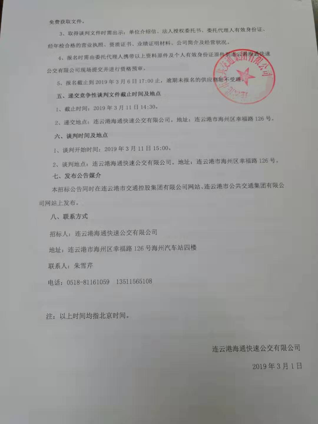 2、谈判地点:连云港海通快速公交有限公司。地址:连云港市海州区幸福路126号。