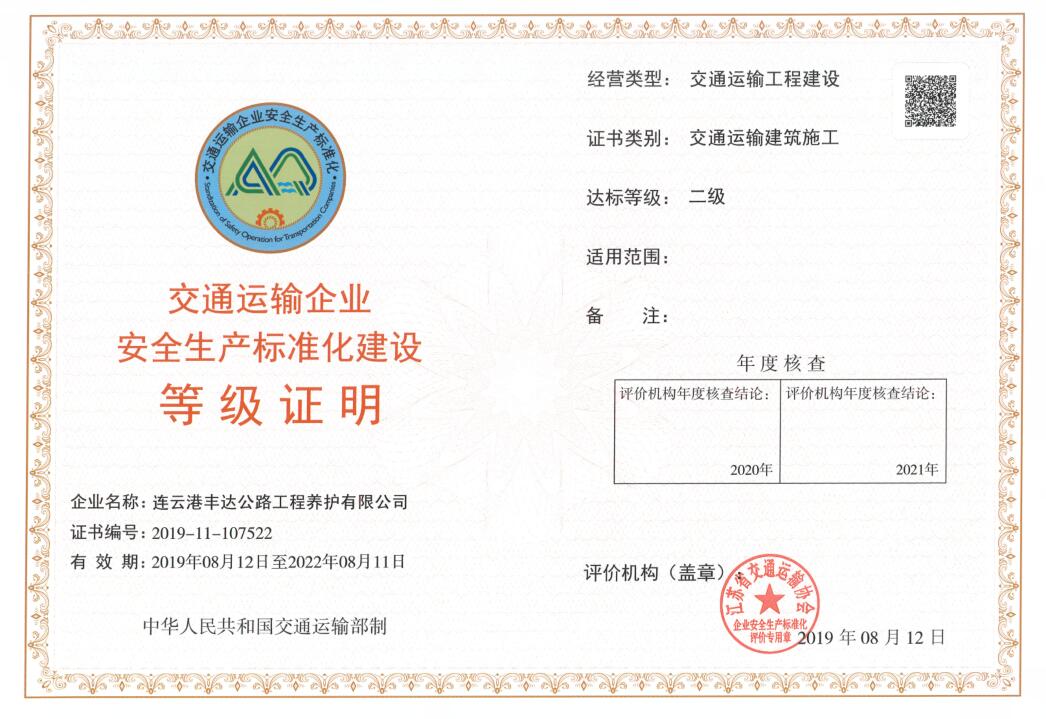今年以来,丰达公司积极开展安全生产标准化达标创建工作,将安全生产标准化工作纳入公司常态化管理,对照《交通运输企业安全标准化》考核细则,先后修订完善了安全管理制度7个,安全职责6个,各种规程3个,公司安全基础设施建设和基础管理逐步加强,生产作业现场管理日趋规范,安全生产管理水平稳步提升。现已被江苏省交通运输协会认定为交通运输企业安全生产标准化建设二级企业。