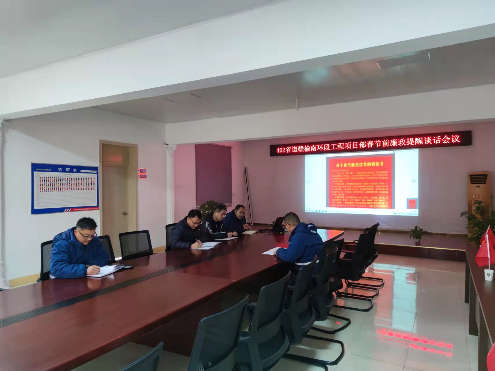春节将至,为强化节日期间廉洁意识,营造风清气正的节日氛围。按照公司党委要求,1月25日上午,江苏海建公司402省道赣榆南环段工程项目部召开春节前集体廉政提醒谈话会议,由项目经理周余宽主持会议,项目部全体职工参加会议。