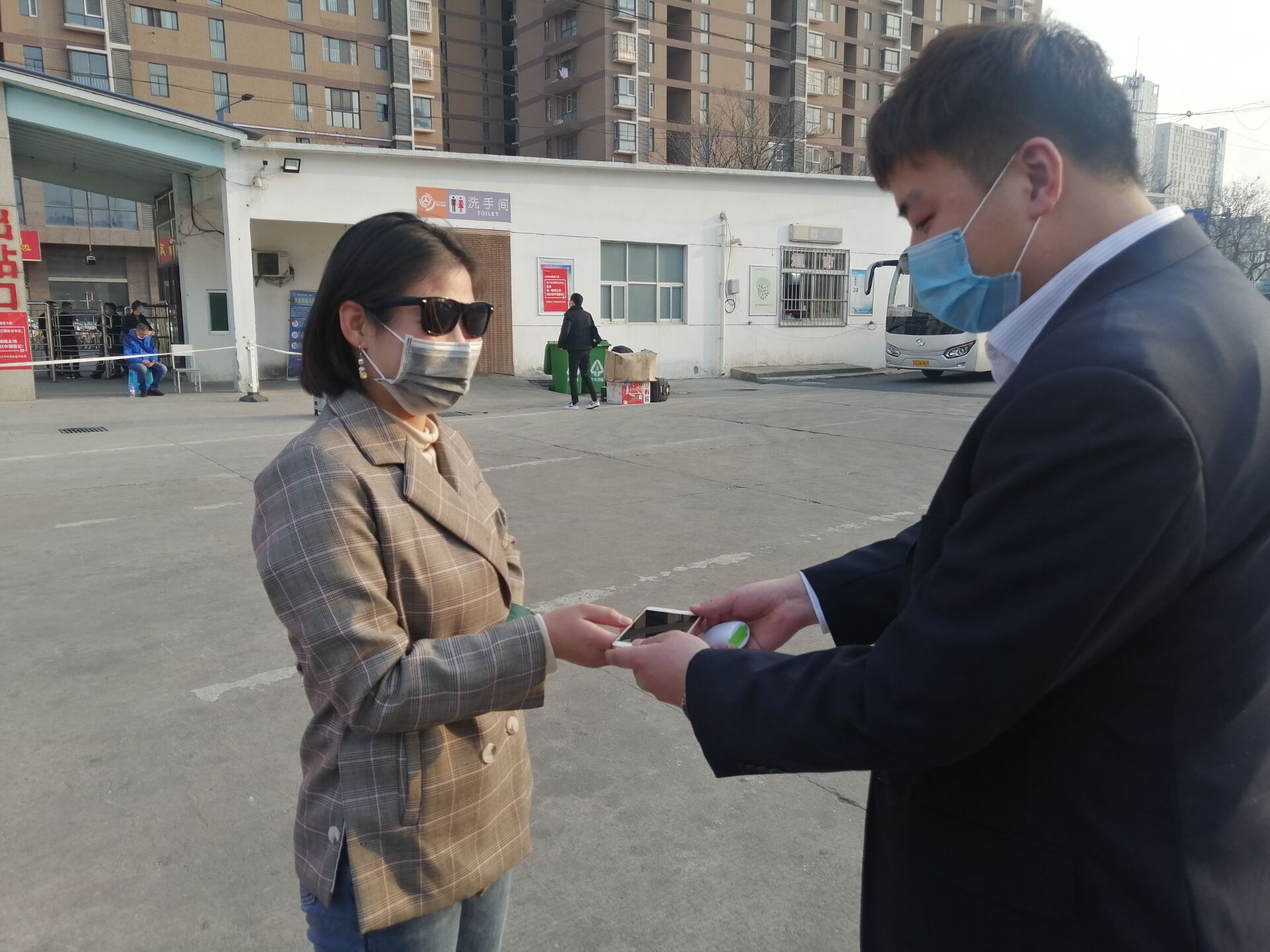 4月15日下午5点多,在苏欣快客站下客区的快客公司测量体温值班人员将一名粗心乘客丢失的手机及时归还给失主,获得失主的连声感谢。