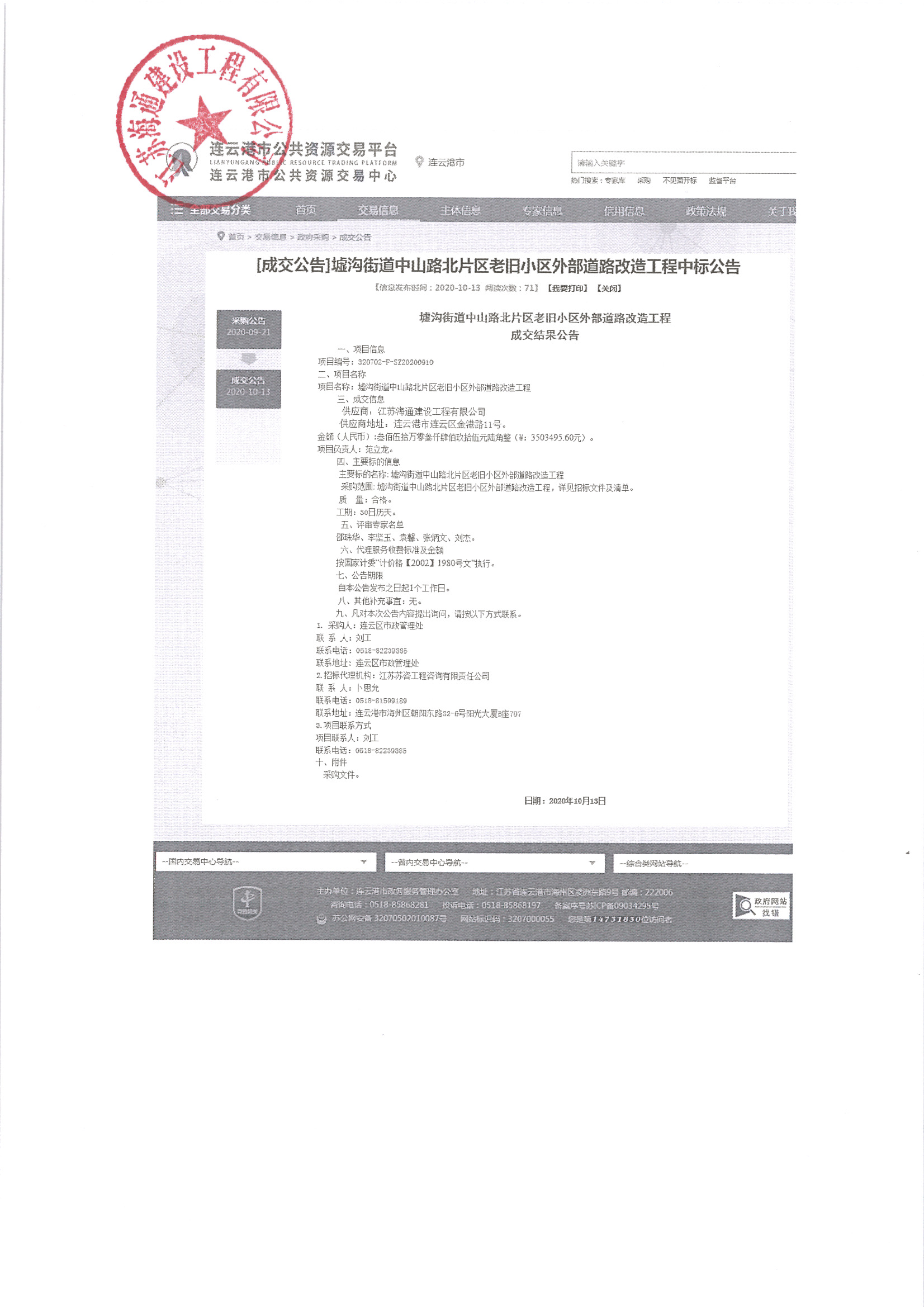 江苏海建于2020年10月12日所递交的墟沟街道中山路北片区老旧小区外部道路改造工程投标文件已被招标人——连云区市政管理处接受,于2020年10月13日被定为墟沟街道中山路北片区老旧小区外部道路改造工程供应商。中标价为(大写)叁佰伍拾万零叁仟肆佰玖拾伍元陆角整(¥3503495.60元),项目负责人范立龙。