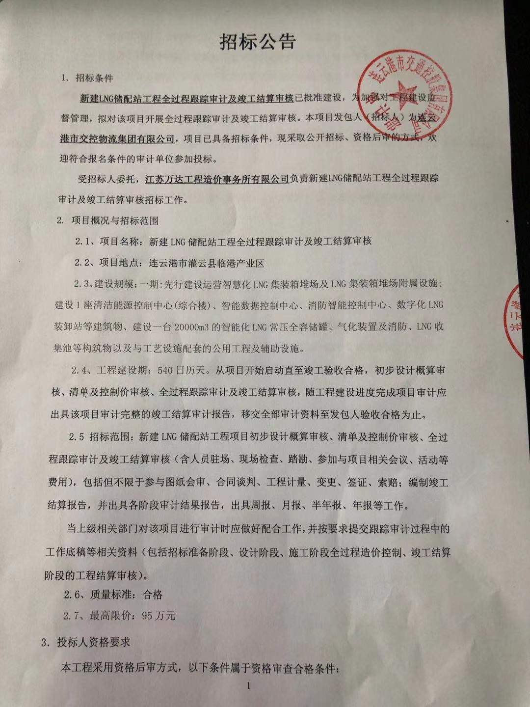 新建LNG储配站工程全过程跟踪审计及竣工结算审核已批准建设,为加强对工程建设监督管理,拟对该项目开展全过程跟踪审计及竣工结算审核。本项目发包人(招标人)为连云港市交控物流集团有限公司,项目已具备招标条件,现采取公开招标、资格后审的方式,欢迎符合报名条件的审计单位参加投标。