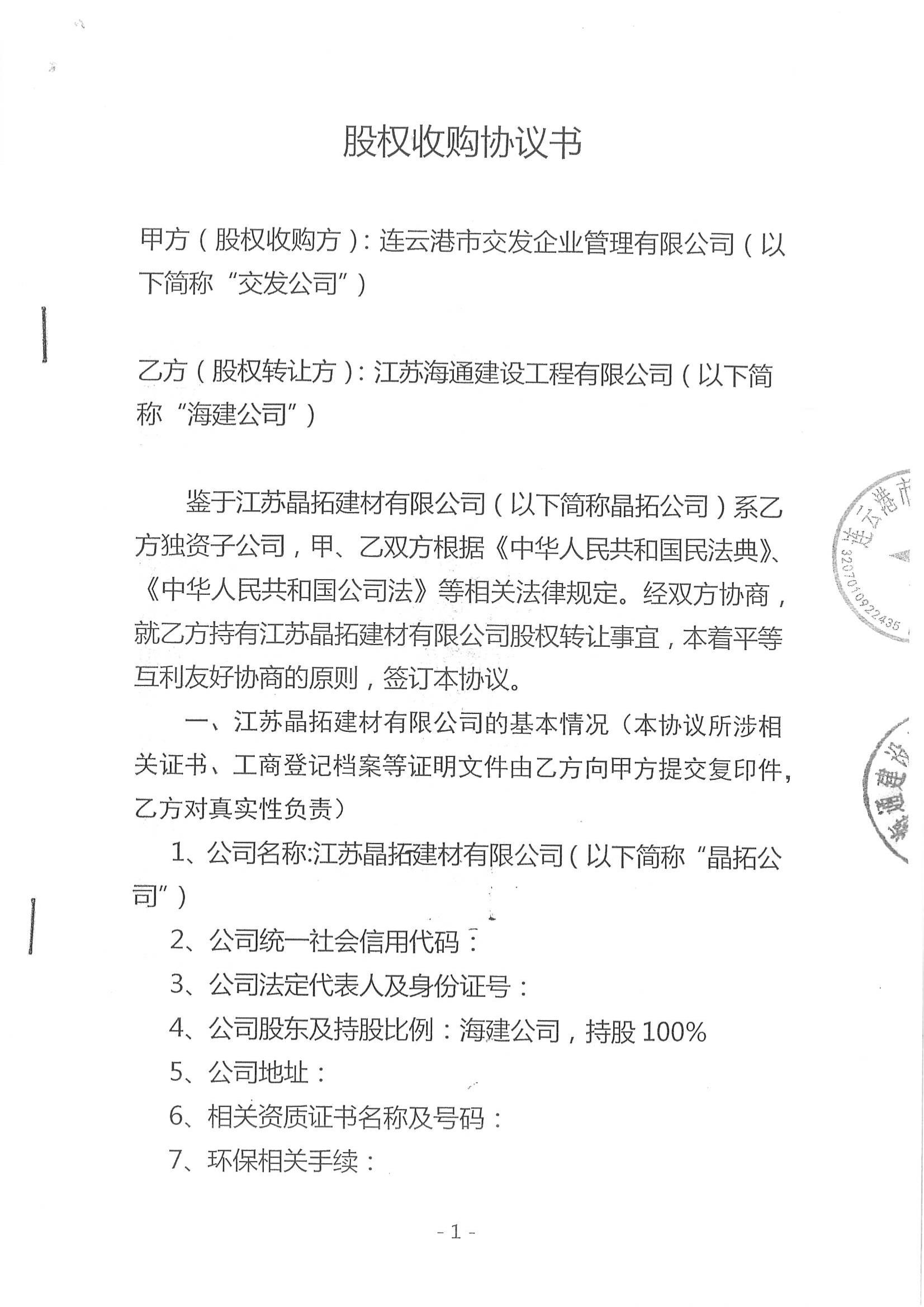 为加强与连云港市交通集团有限公司的深度合作,由江苏海建公司出让江苏晶拓建材有限公司30%股权交割转让连云港市交通集团,目前已完成相关的转让手续。