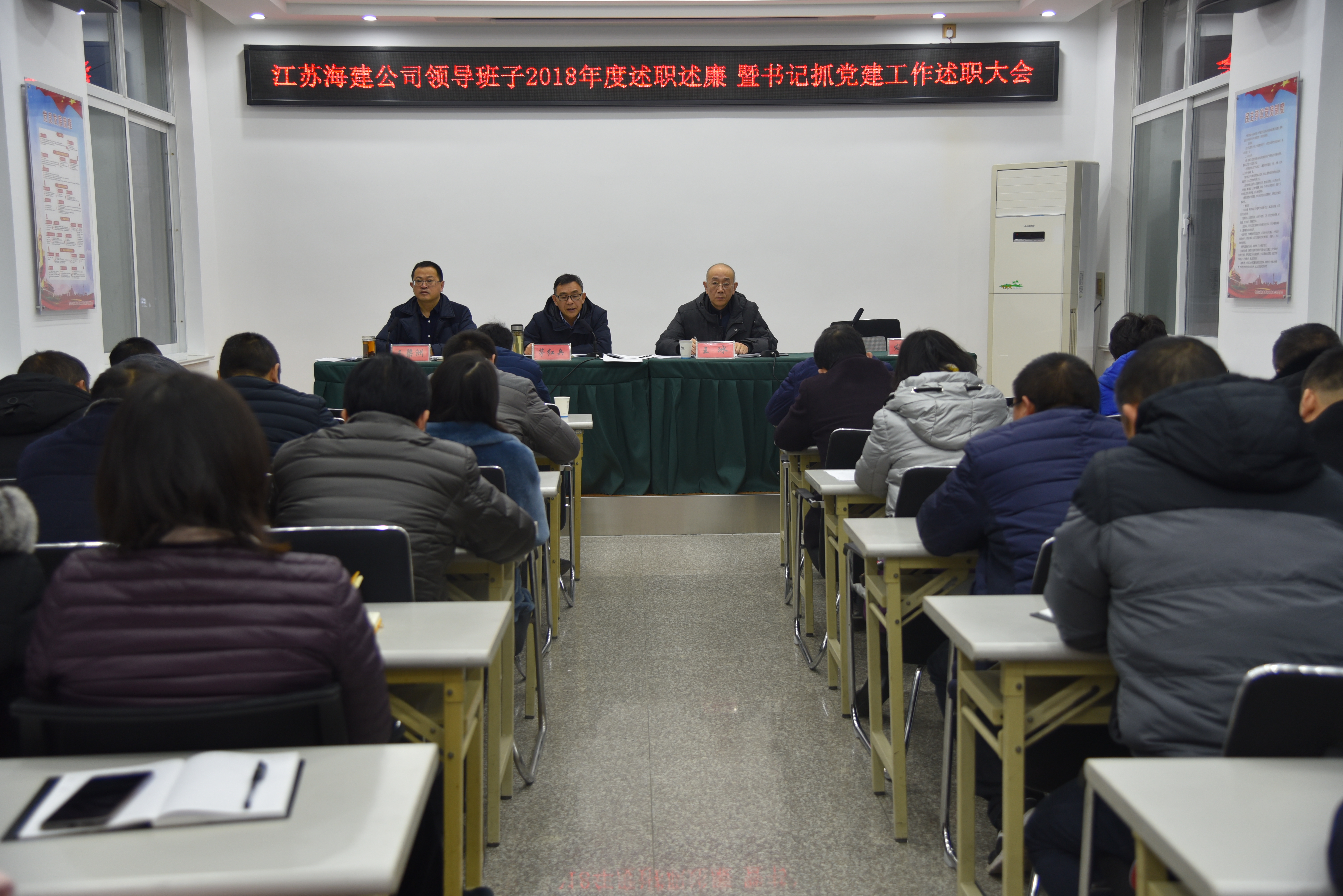 1月24日,江苏海建公司召开2018年度领导班子述职述廉和民主测评大会,机关部门负责人和所属基层单位班子成员30余参加会议。公司董事长茅红兵代表公司党委对领导班子一年来履行职责和落实党风廉政建设责任制的情况作了述职述廉报告,对2018年度进行了全面的回顾总结,查找了不足,以及对群众建议和意见进行了深刻剖析。接着对自己本人2018年度的述职述廉报告作了翔实具体地汇报,集团人力部副部长王冰参加会议,并监督测评情况。