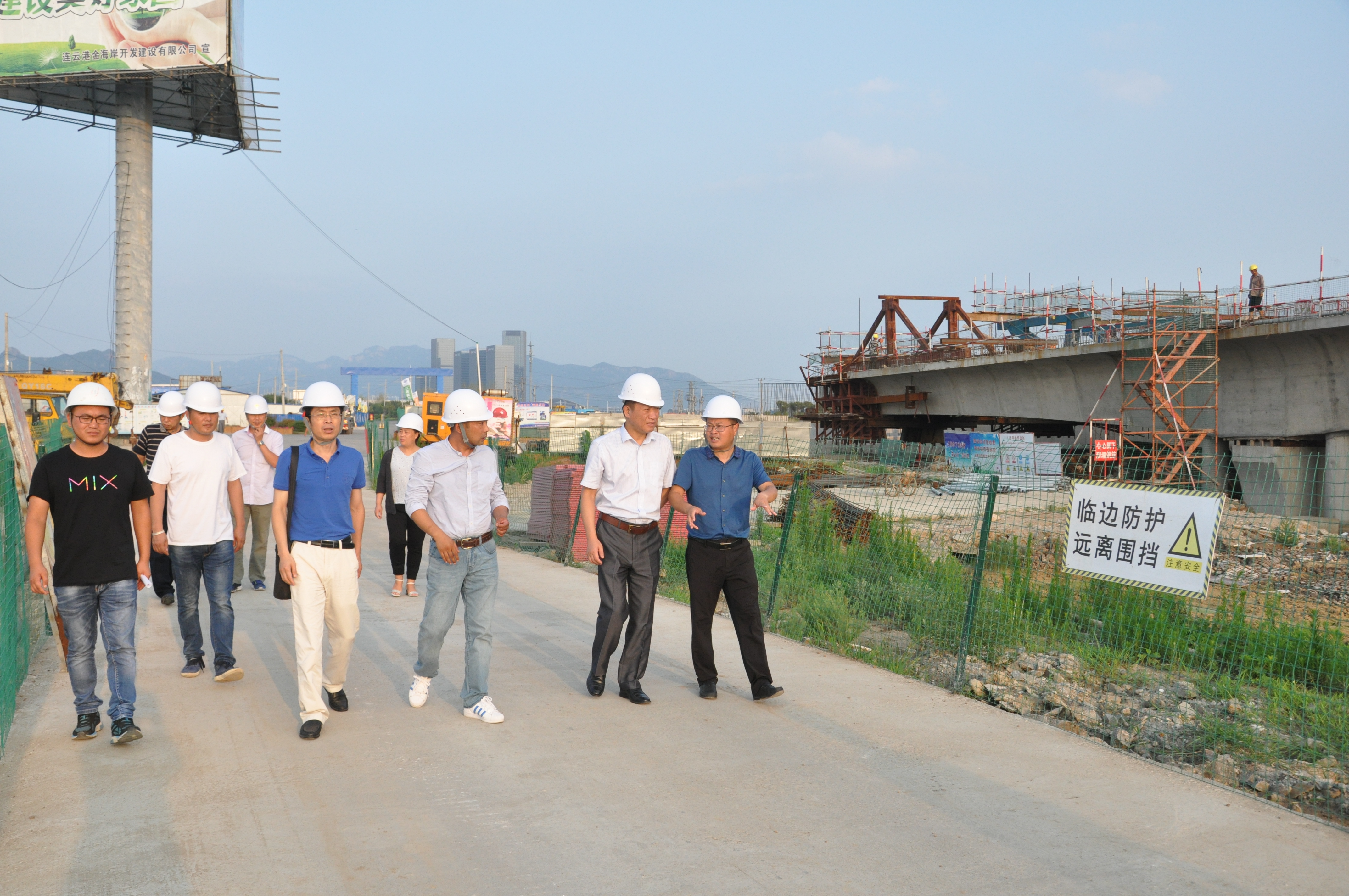 会议结束后,调研组一行先后来到朝阳互通及金海二桥项目部查看工程进展情况。在施工现场,王梁洲同志分别详细介绍了项目基本情况及建设进度,并汇报了施工过程中遇到的问题及解决方案。在金海二桥施工现场,赵洁同志详细了解了项目的工程进展和施工工艺,以及项目周边的配套规划,并听取了关于工程的节点工期、安全管理和汛期排洪工作汇报。