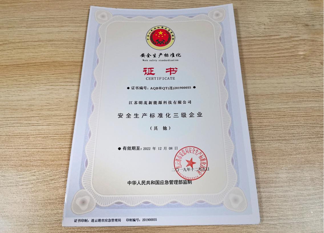 近日,根据市安监局、集团关于进一步加强企业安全生产标准化建设的要求,按照公司的统一部署,经过5个月的准备、咨询、自评等程序,经过公示、公告,12月20日明茂公司顺利取得国家应急管理部颁发的“安全生产标准化三级企业”证书。