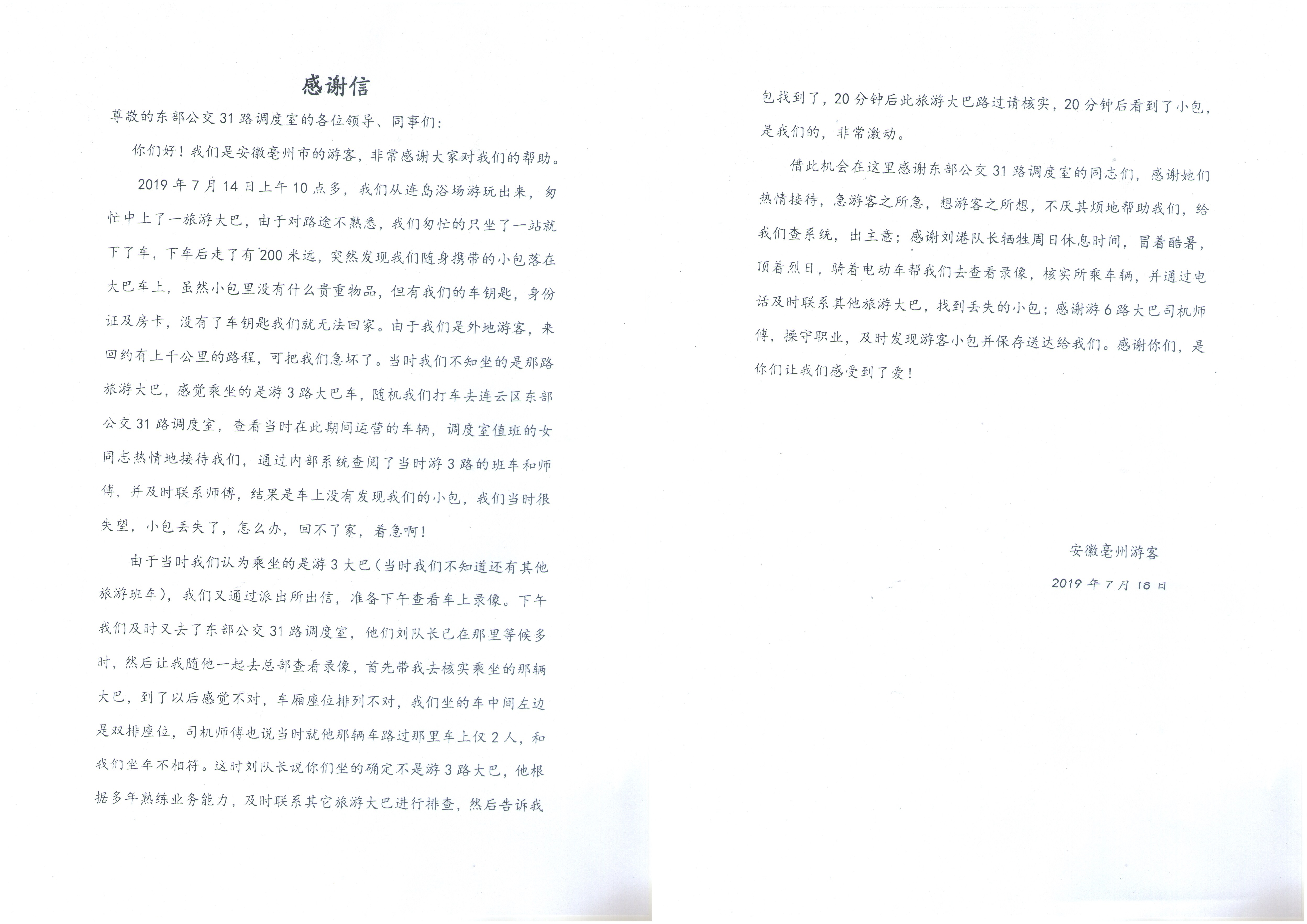 下午,孙先生和朋友再次来到园丁小区调度室,凭借运营经理多年的经验,确定孙先生当时乘坐的不是游3路公交车,应该是游6路公交车,经过核实,果然在在游6公交车上找到丢失的小包。拿回了自己丢失的小包,孙先生激动之前无以言表,在平安到家之后寄来锦旗和感谢信,表达自己对工作人员的感激之情。