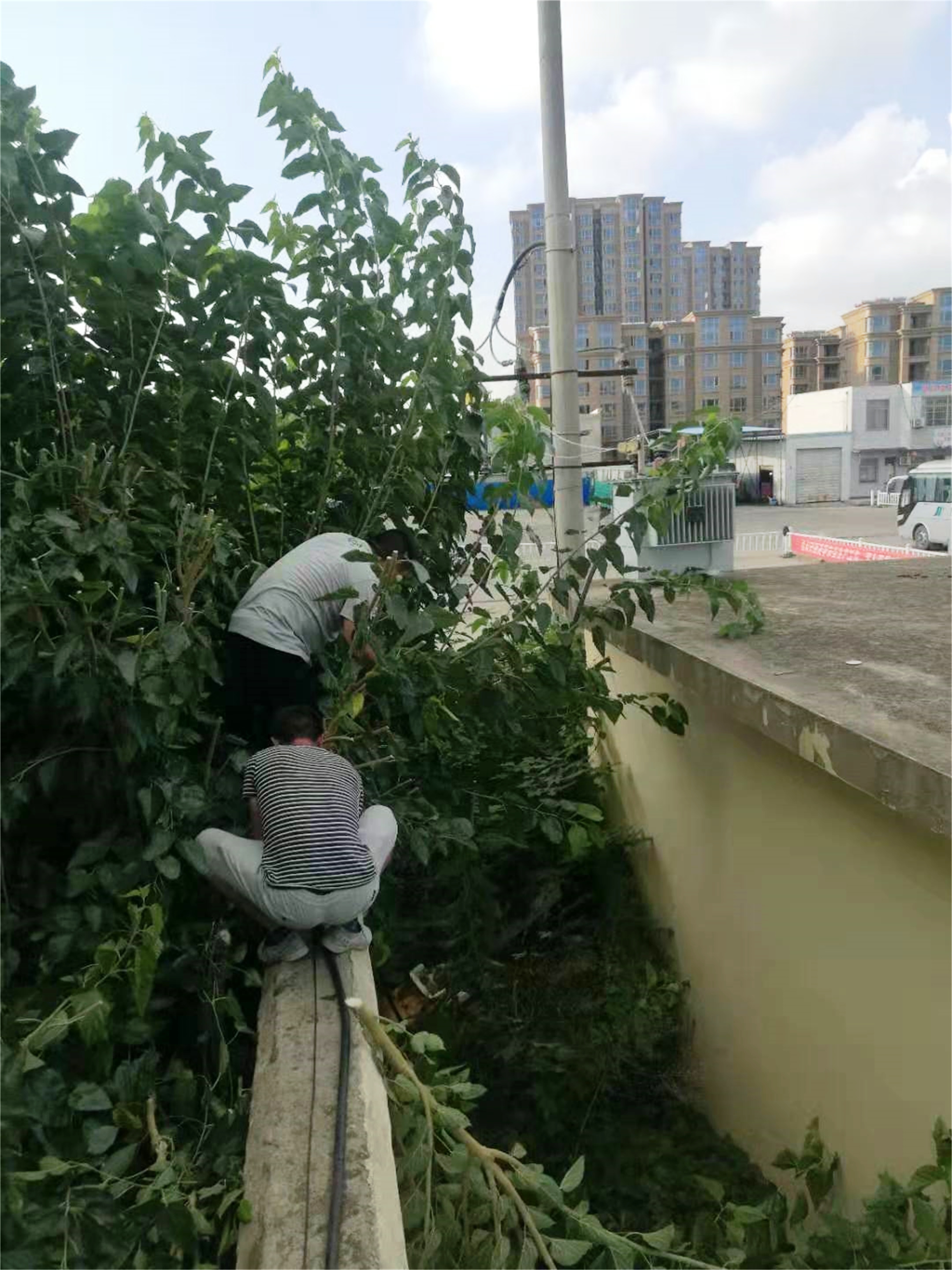 排查中,公司后勤人员发现变压器上方树枝过于茂密,如果刮起大风很可能发生高压线路短路的现象,极易造成安全生产事故,从而影响公司正常用电。后勤人员顾不上天气炎热,带上斧头、长剪子,爬上高墙,砍除杂乱小树及树枝。经过近一个小时的努力,变压器周围内杂乱的树枝得到了清理,在台风来临前消除了安全隐患。