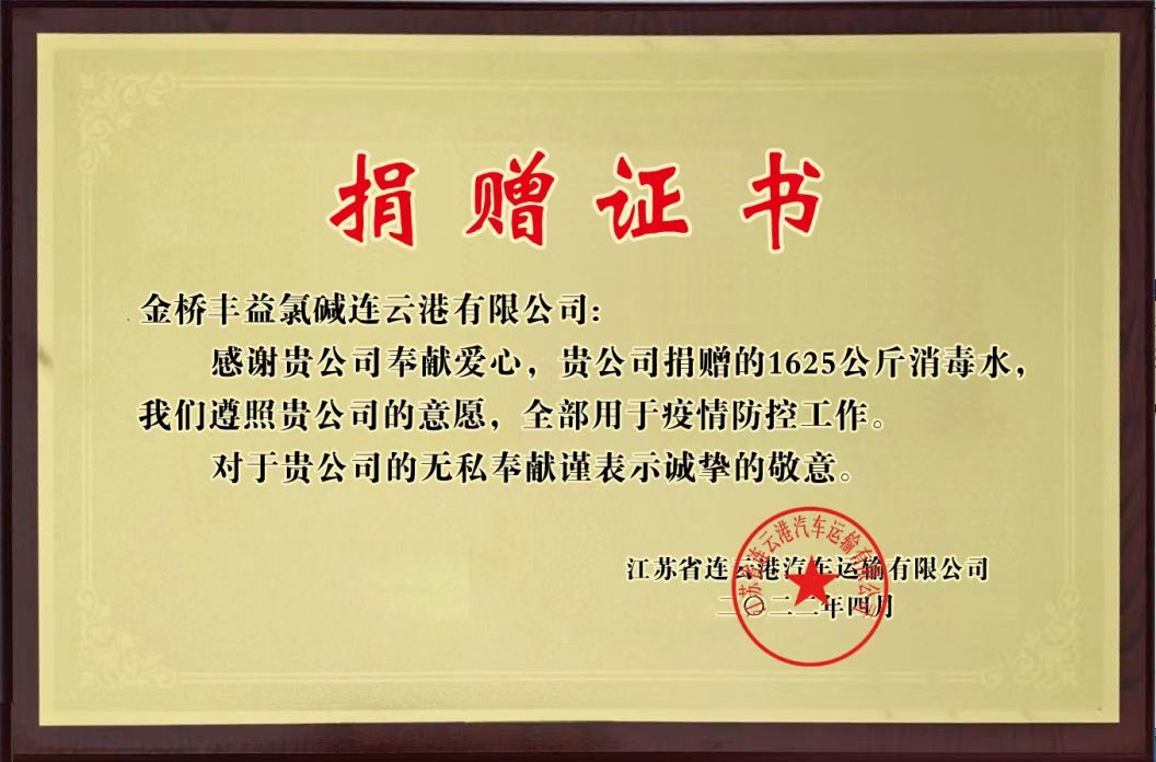 4月15日,连云港汽车运输有限公司经营发展部部长王平向金桥氯碱丰益(连云港)有限公司赠送捐赠证书,以感谢其在疫情防控期间对汽车公司疫情防控工作的大力支持。
