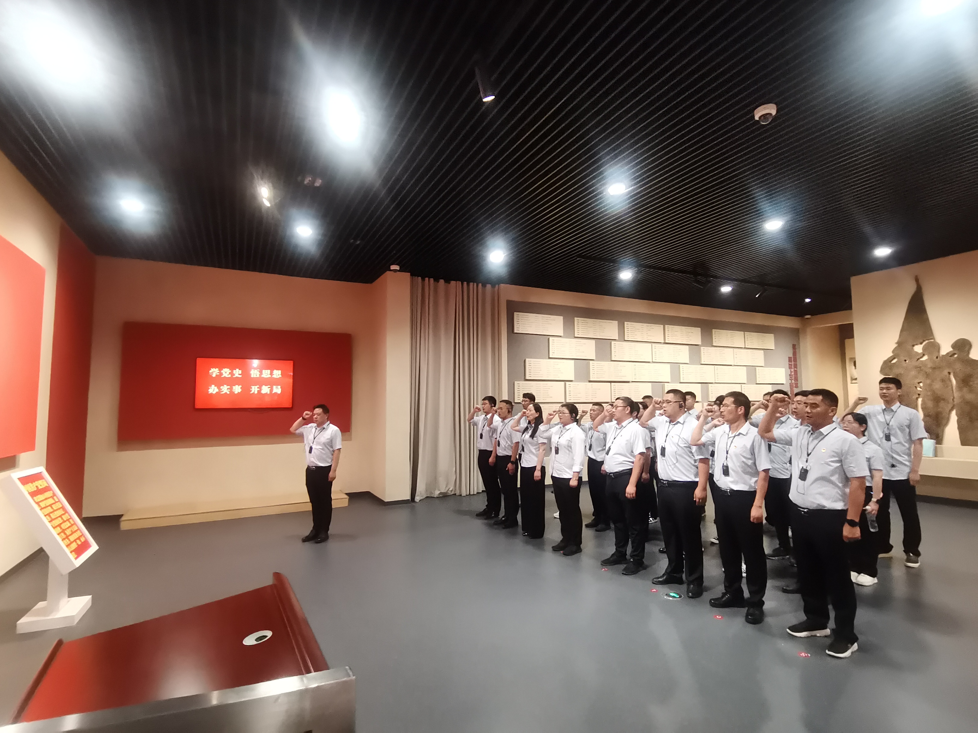 新四军纪念馆由主馆区、新四军重建军部纪念塔、新四军重建军部旧址三部分组成。建筑外形的“四”字形设计、正门上新四军的“N4A”臂章图案、馆内“铁军铸魂—新四军陈列”的大型雕塑,在纪念馆内可以全景式了解新四军从组建到发展、从巩固到壮大的光辉历程。近5000平方米的展厅运用声光电等现代化展示手段,再现了新四军八年抗战、十年征程的烽火岁月。结合讲解员的介绍,帮助大家更好地了解红色传统文化,学习革命先烈的意志品质,树立正确历史观,弘扬爱国主义情怀。随后,党员干部来到一楼大厅,面向鲜红的中国共产党党旗,重温入党誓词,充分展现了集团干部职工的责任和担当。