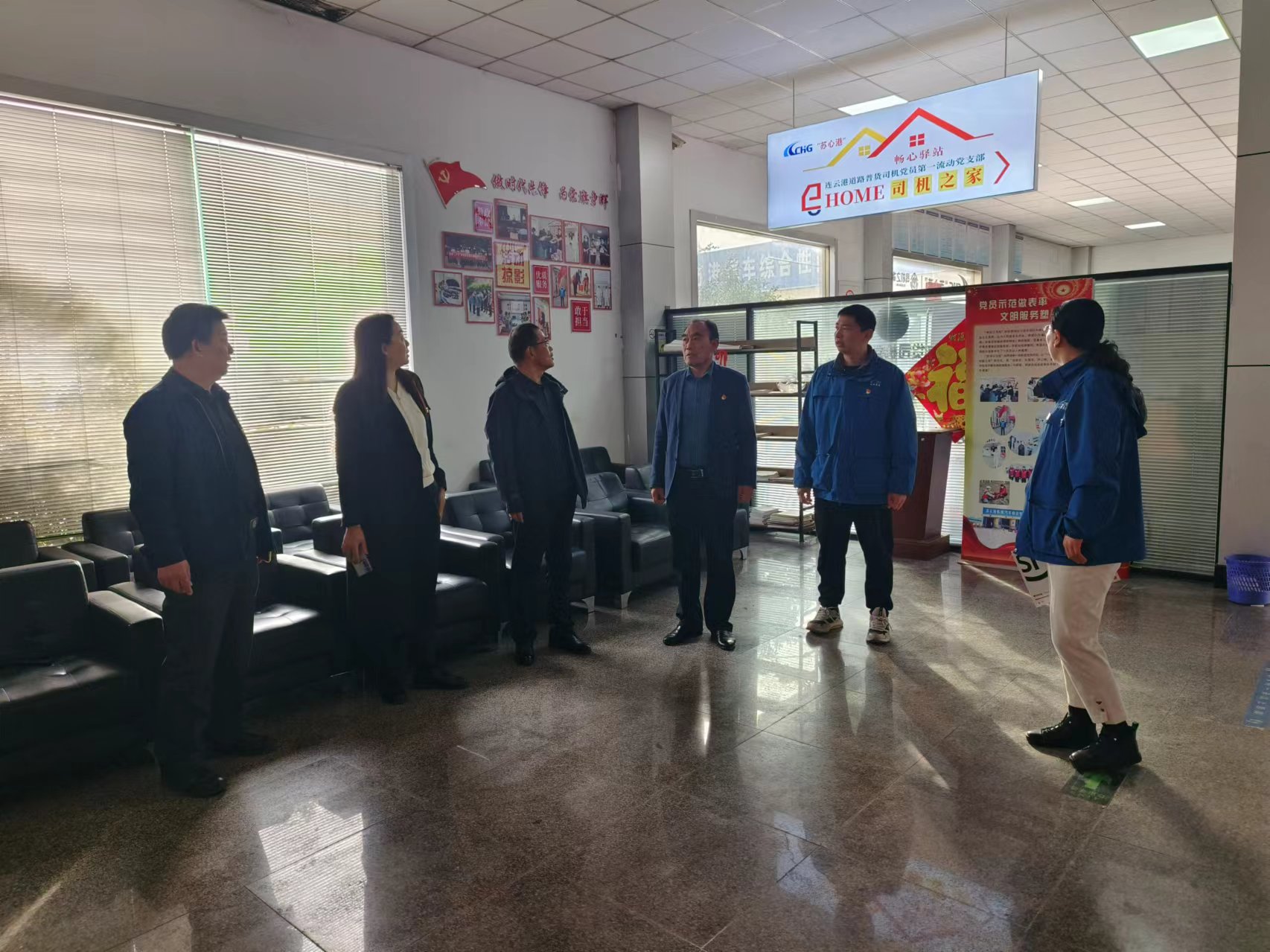 座谈会结束后,双方党员代表共同前往“苏心港”司机之家开展实地参观调研。在“苏心港”工作人员的引导下,大家先后参观了休息区、图书角等功能区域,详细了解司机之家的运营模式、服务内容及日常接待情况。参观过程中,双方结合机动车检测行业服务特点,就“苏心港”后续发展提出诸多切实可行的建议,增加机动车检测政策咨询服务,帮助司机群体及时了解检测新规,搭建“检测 + 服务”联动平台,为司机提供检测预约、车辆保养等一站式服务,加强“苏心港”品牌宣传,扩大服务覆盖面,让更多司机感受到行业关怀。