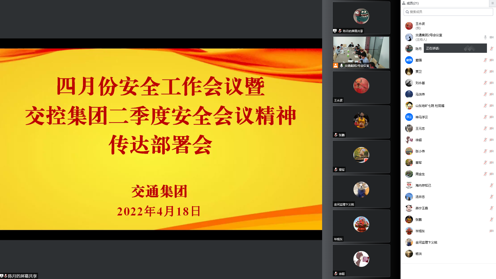 4月18日,交通集团召开四月份安全工作会议暨交控集团二季度安全会议精神传达部署会,集团各部门、各公司负责人,工程项目施工、监理负责人参加会议。交通集团总经理宣有金出席会议并讲话。