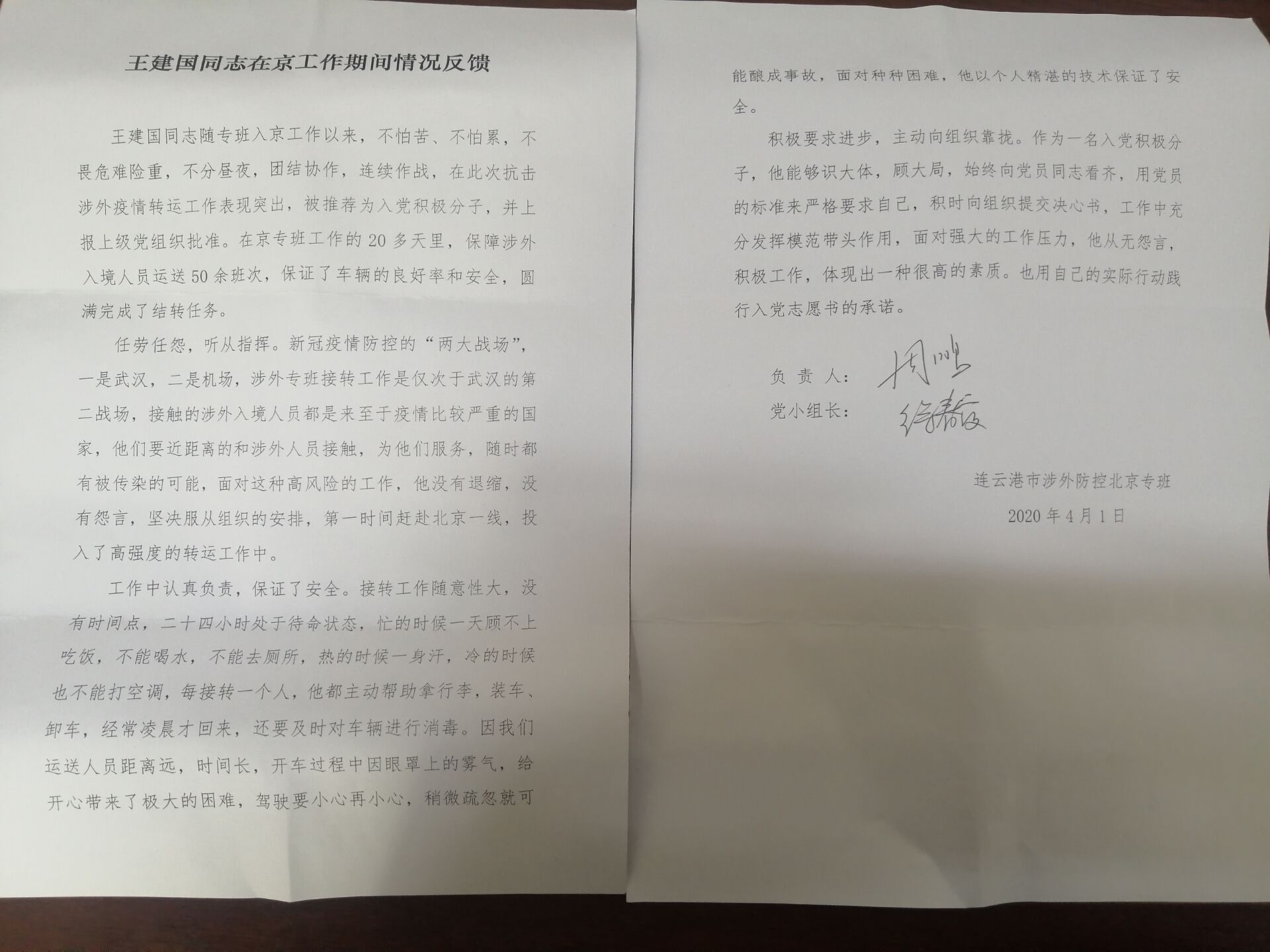 从3月初开始,因国外疫情爆发,大批涉外华人选择回国。连云港涉外防控指挥部需要汽车公司选派一批优秀驾驶员参与归国人员转运任务。王建国得知这一情况后主动请缨,并于3月10日,向党组织递交了入党申请书,第二天,他与同样是党员的潘洪斌赶赴驻北京疫情防控第一线。