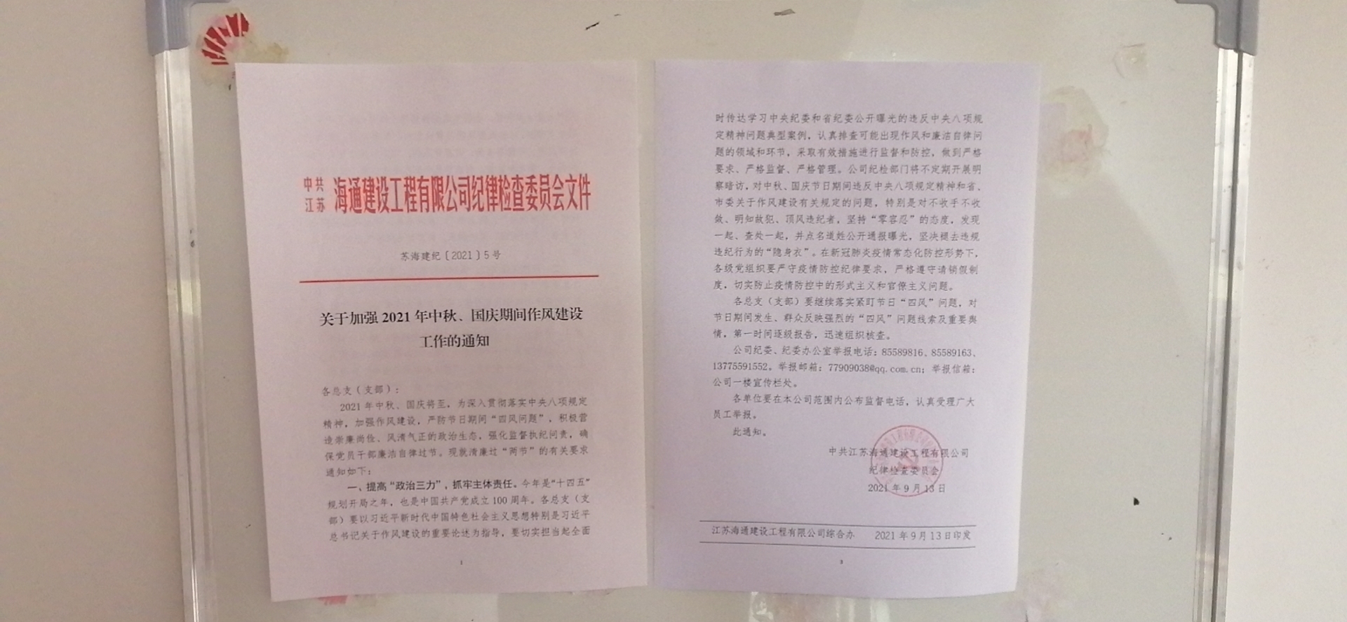 双节将至,为进一步落实中央、省、市关于作风建设各项规定,深入推进作风建设,坚决防止“四风”问题反弹,切实做好中秋、国庆期间廉洁自律工作,海建公司党委高度重视,多措并举,坚决预防和杜绝节日腐败问题,抓好节日期间党员干部纪律作风建设,确保党员干部清正、廉洁。