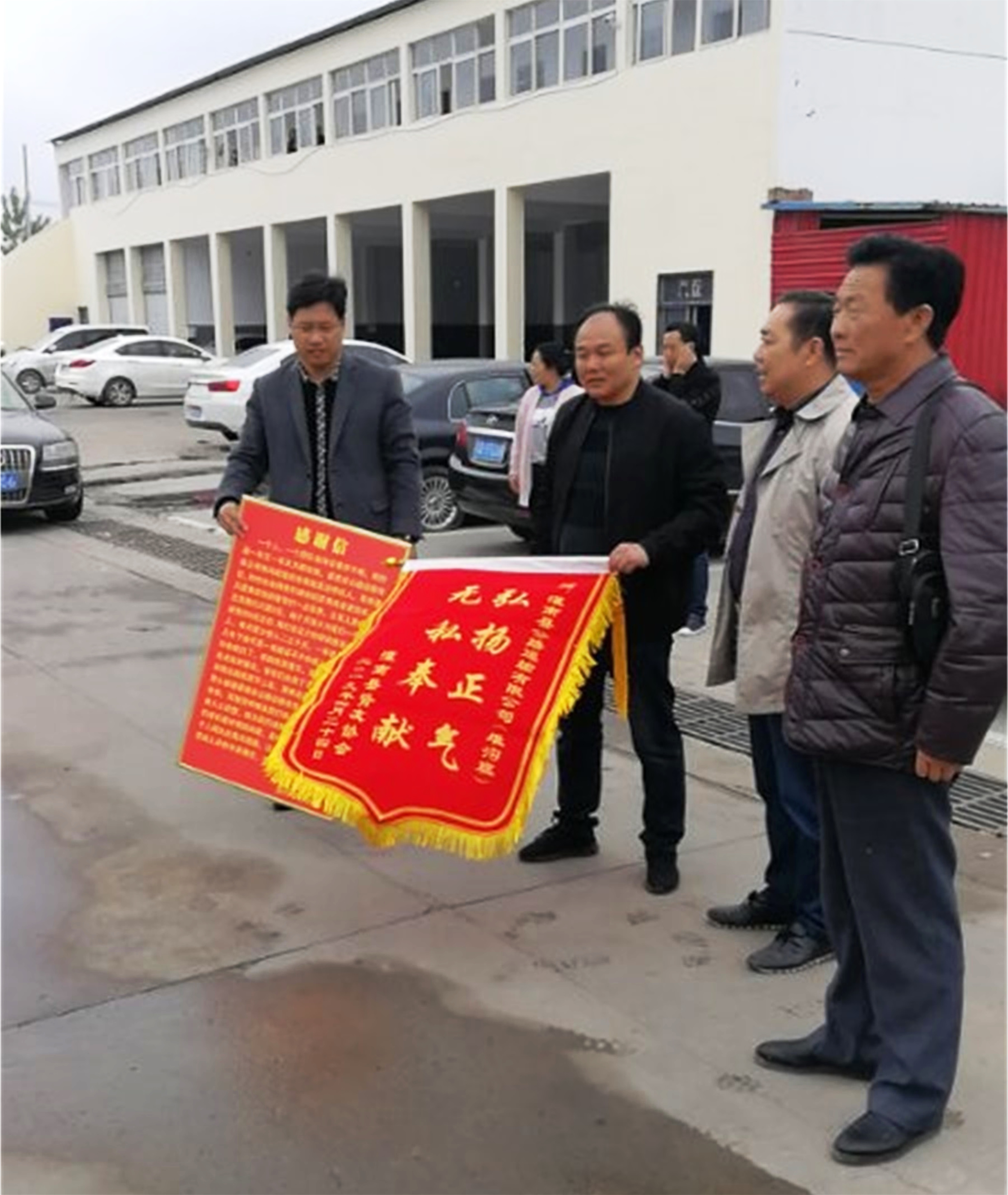 4月24日上午9时20分许,灌南公司公交分公司办公室前响起一阵鞭炮声,一群人挤进办公室,找到公司经理助理孙展鹏,向他送上写有“弘扬正气,无私奉献”的锦旗和感谢信。