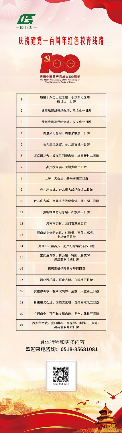 喜迎建党百年,重温光辉党史。为了让更多游客充分感受中国共产党带领全国各族人民在中国革命、建设和改革历史进程中取得的重大成就,连汽旅游公司推出了“迎百年华诞,忆峥嵘岁月”红色主题游,精心筛选打造21条全国红色教育线路。