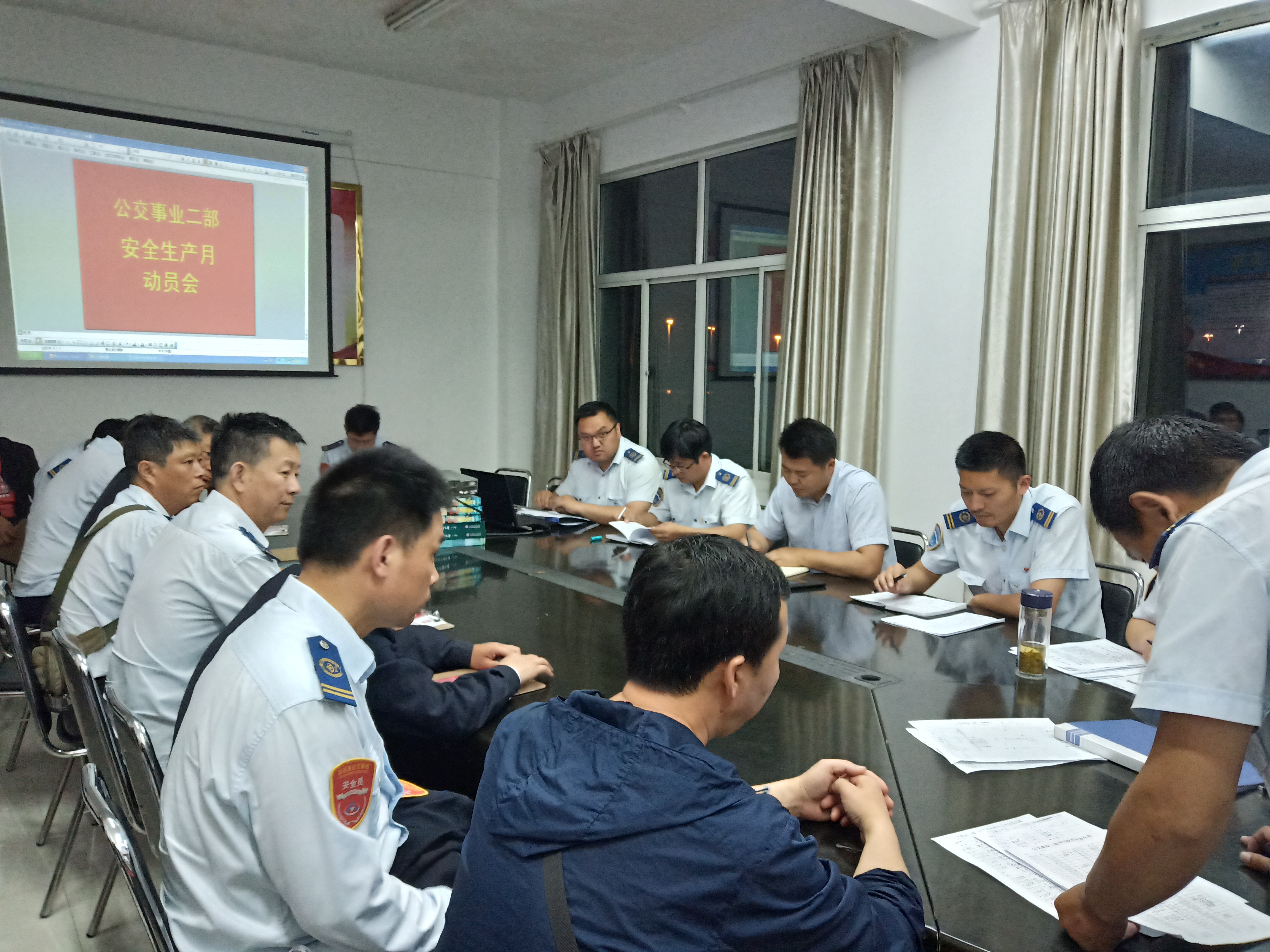 为切实推进安全生产月各项活动的开展,落实安全管理各项工作,不断夯实安全管理基础,提升安全管理水平,5月28日—5月30日,公交集团公交事业二部在二楼会议室分批召开“2019年安全生产月动员会”,事业部领导班子成员、管理人员及全体驾驶员参加了会议。