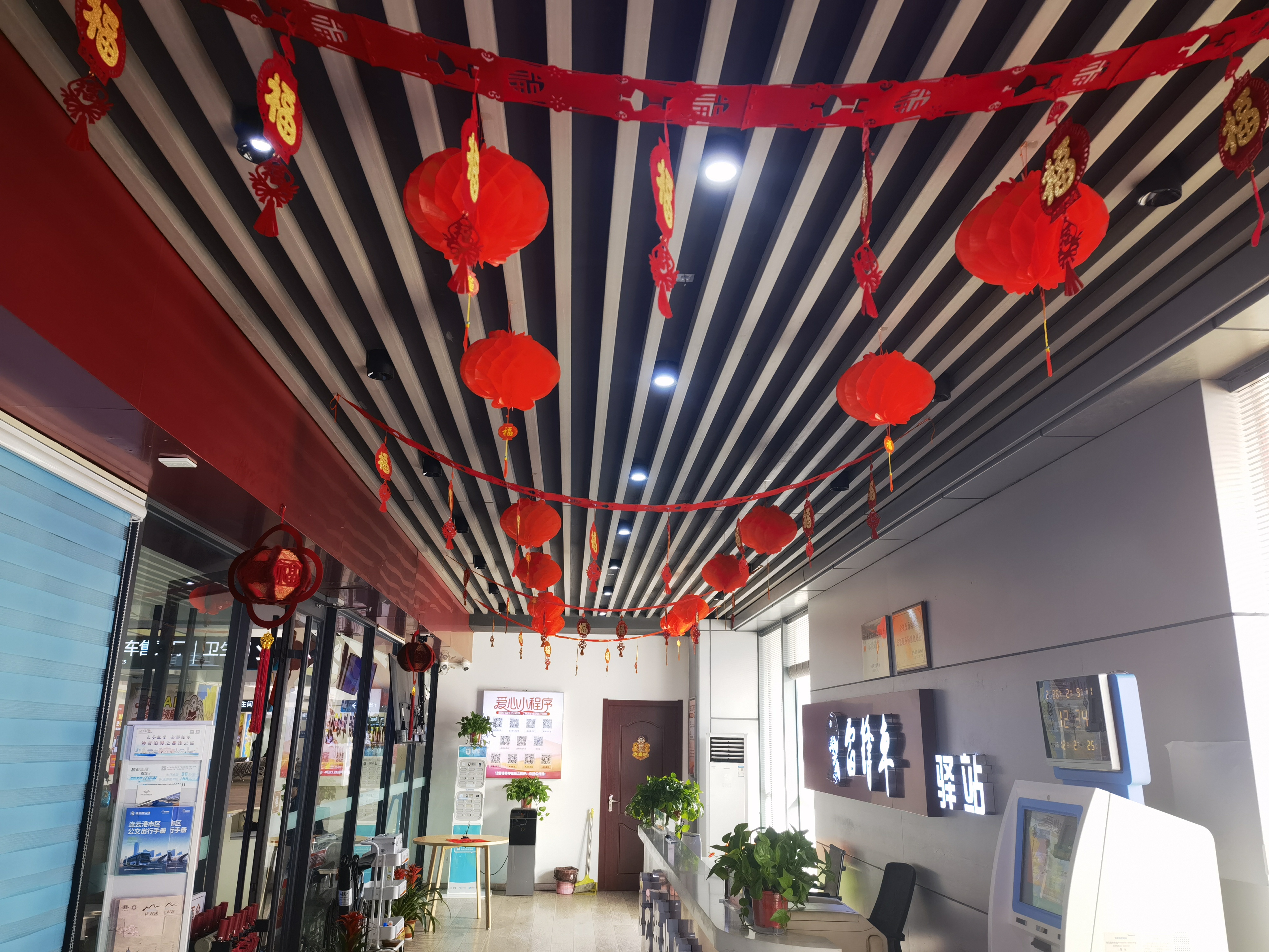 环境布置巧用心,马年年味满站场。公司权属各客运站提前谋划、精心筹备,对站场内外进行全方位清扫保洁,彻底清理卫生死角,确保候车厅、站前广场、检票口等区域干净整洁、井然有序,为旅客营造舒适的出行环境。同时,以“迎马年、庆新春、送祝福”为主题,开展全方位装饰布置:候车室内外悬挂起红彤彤的灯笼、寓意吉祥的中国结,玻璃窗上张贴着喜庆的窗花,红金相映的装饰错落有致,处处洋溢着热烈喜庆的马年春节氛围。