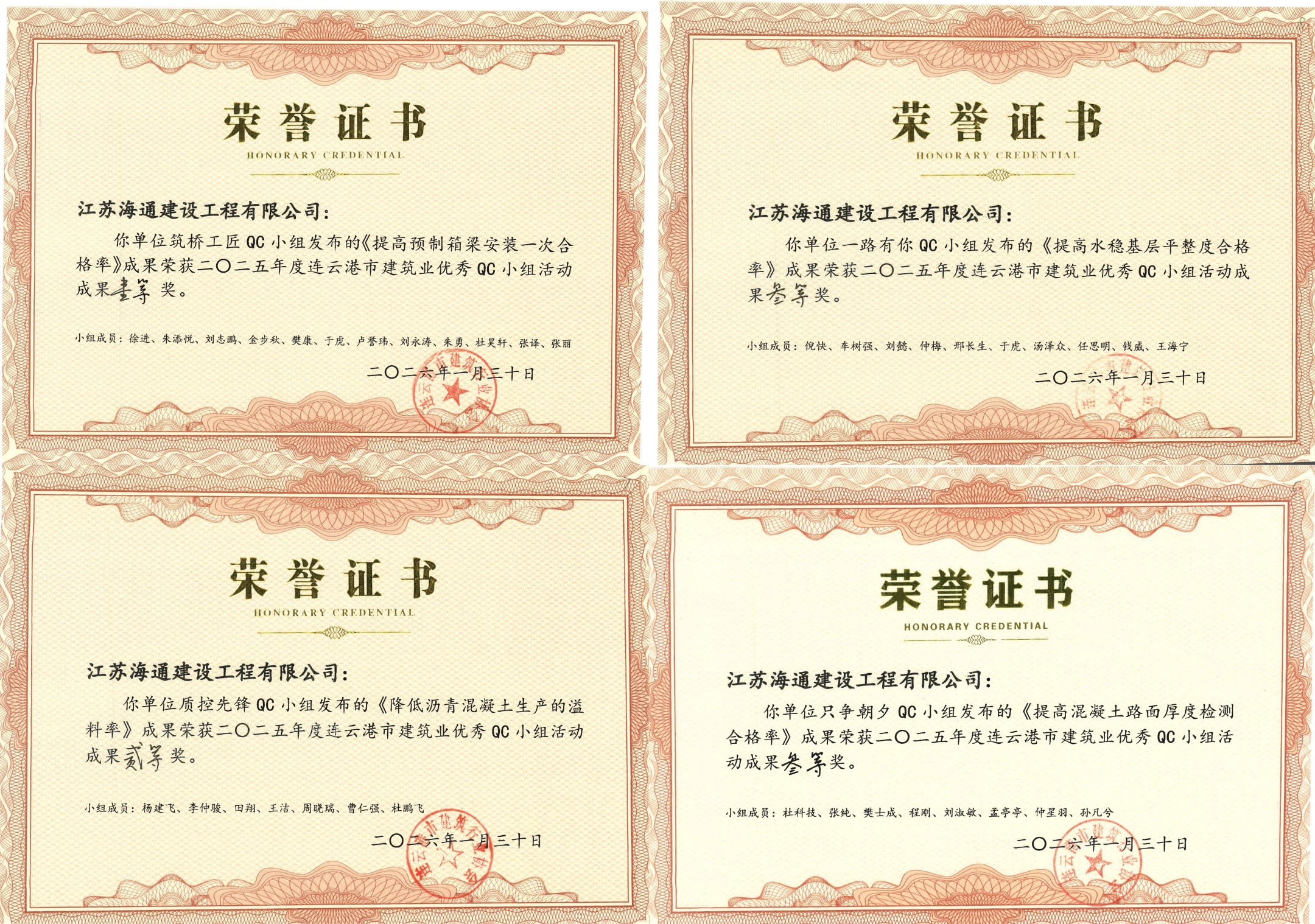 此次获奖的5项成果分别为《提高预制箱梁安装一次合格率》《降低沥青混凝土生产的溢料率》《提高混凝土路面厚度检测合格率》《提高水稳基层平整度合格率》《箱梁预应力张拉质量控制》,均是围绕施工一线、生产一线存在的质量技术管理问题开展的质量技术攻关活动。QC小组质量管理活动是我们激发一线创新活力的重要载体,鼓励员工围绕“质量、成本、安全、效率”四大核心开展攻关,持续完善质量管理体系,达到了提高施工效率、降低生产成本的目的,为公司高质量发展增势赋能。