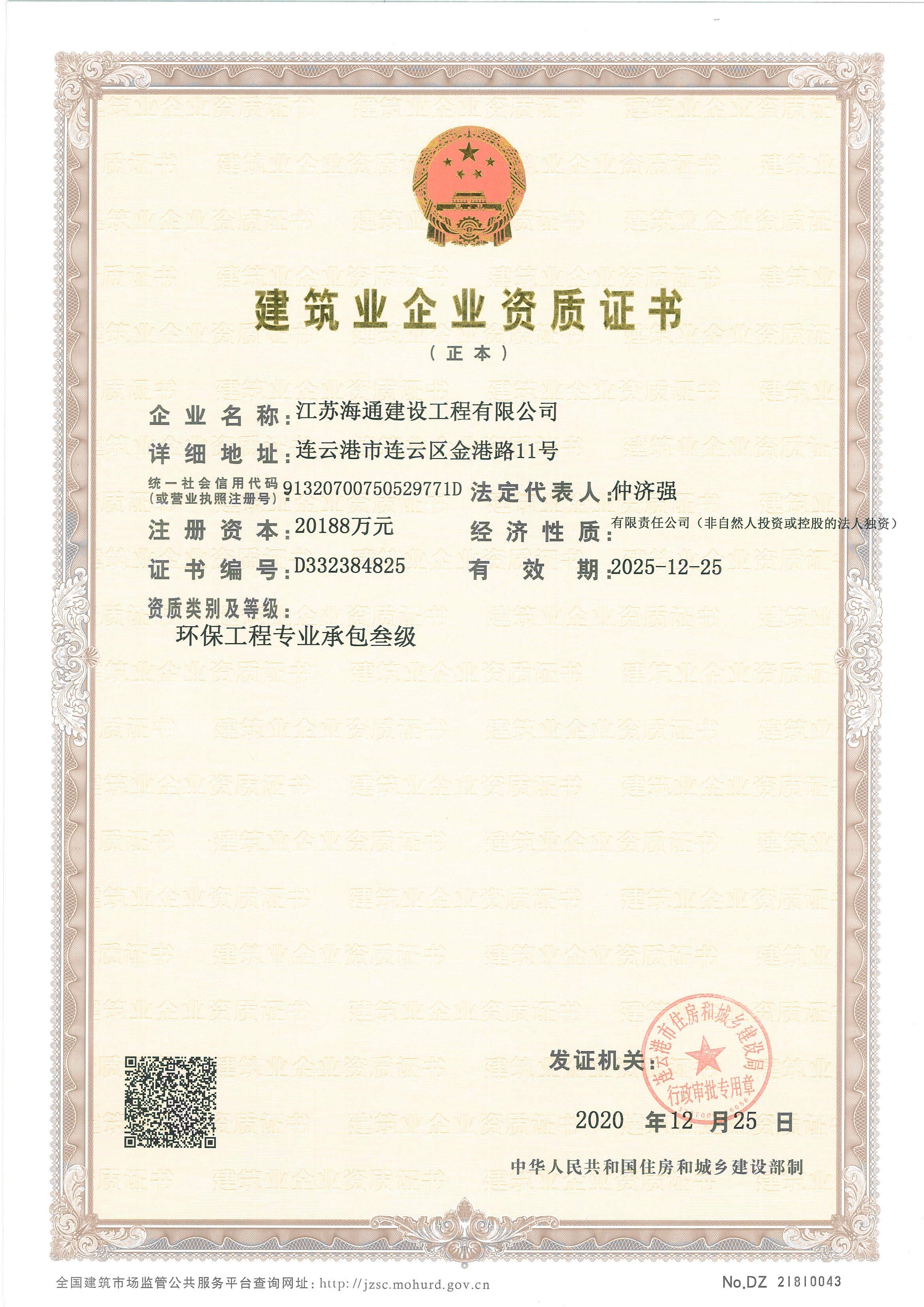 近日,江苏海建公司顺利通过连云港市住房和城乡建设局对公司资质增项申请的审查,成功获取了环保工程专业承包叁级资质证书。
