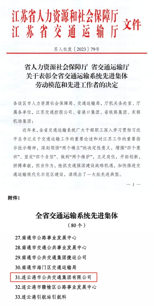近日,公交集团被省人力资源社会保障厅、省交通运输厅授予“全省交通运输系统先进集体”荣誉称号。