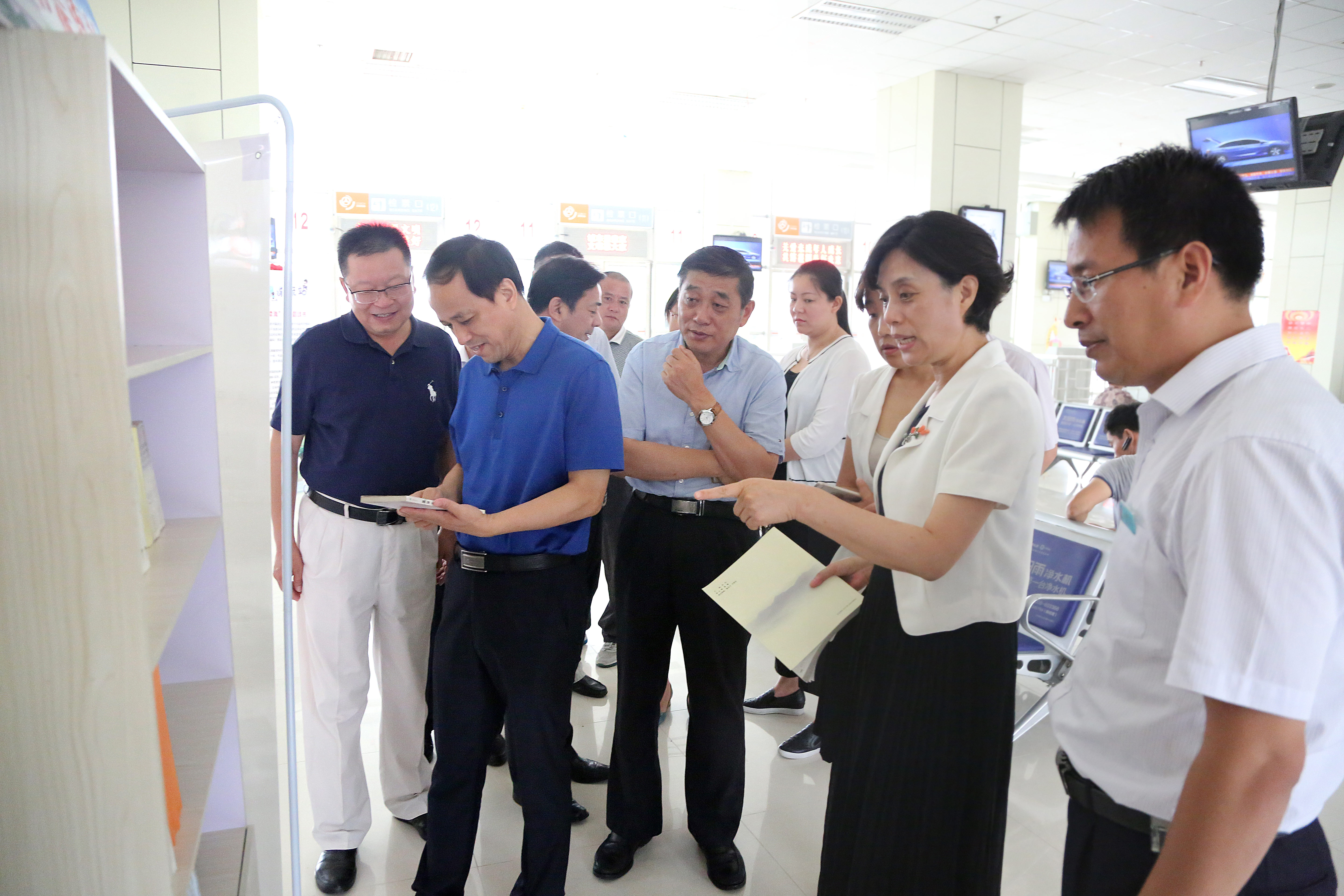 滕雯一行先后调研了新浦汽车总站候客大厅图书漂流站和电子图书屏等设施,详细听取了汽车公司有关负责人对图书漂流站建设情况的介绍。
