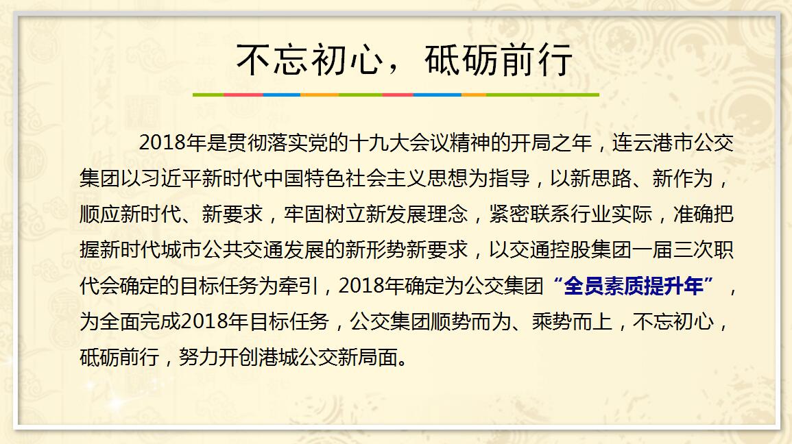 新时代是奋斗者的时代!我们要更加坚定地以习近平新时代中国特色社会主义思想为指引,牢记创业者与奋斗者的使命与担当,鼓足干劲、凝心聚力。以“时不我待,只争朝夕”精神状态,投身到伟大事业中去,踏上新征程,迈进新时代,为全面打造政府放心、人民满意、职工幸福的公交企业而努力奋斗!