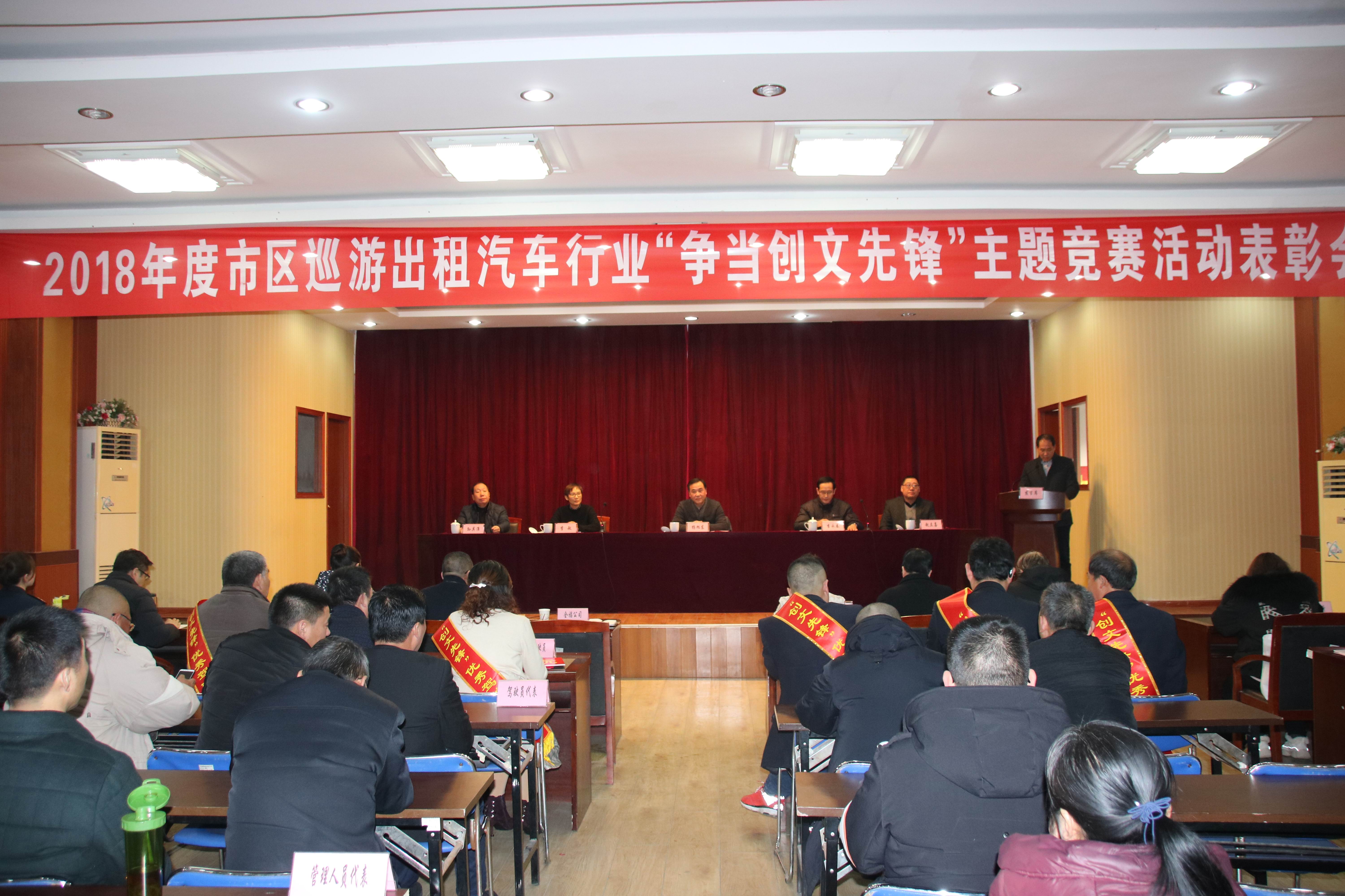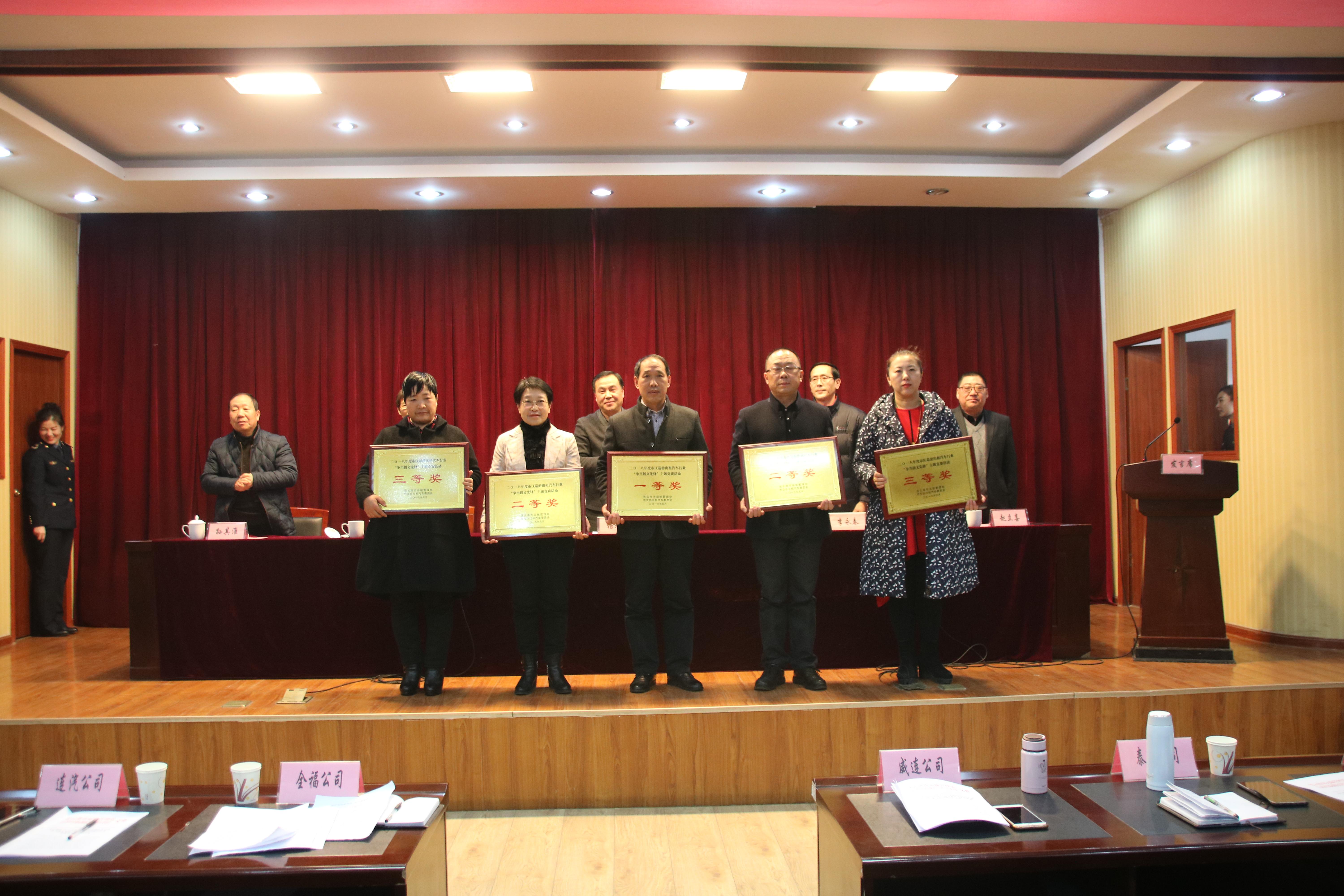 “争当创文先锋”文明服务主题竞赛活动总结表彰会,市交通运输局党委委员、副调研员杨旭东、市运管处党委书记李永春、副处长李敏、汽服公司副总经理赵立喜、出租行业协会会长孙其准等领导为获奖的市区五家出租公司及十位优秀出租车驾驶员颁发了证书。全福公司荣获“争当创文先锋”主题竞赛活动一等奖,驾驶员章文彩、李鸿祥、江希勇获得“争当创文先锋”优秀驾驶员殊荣。