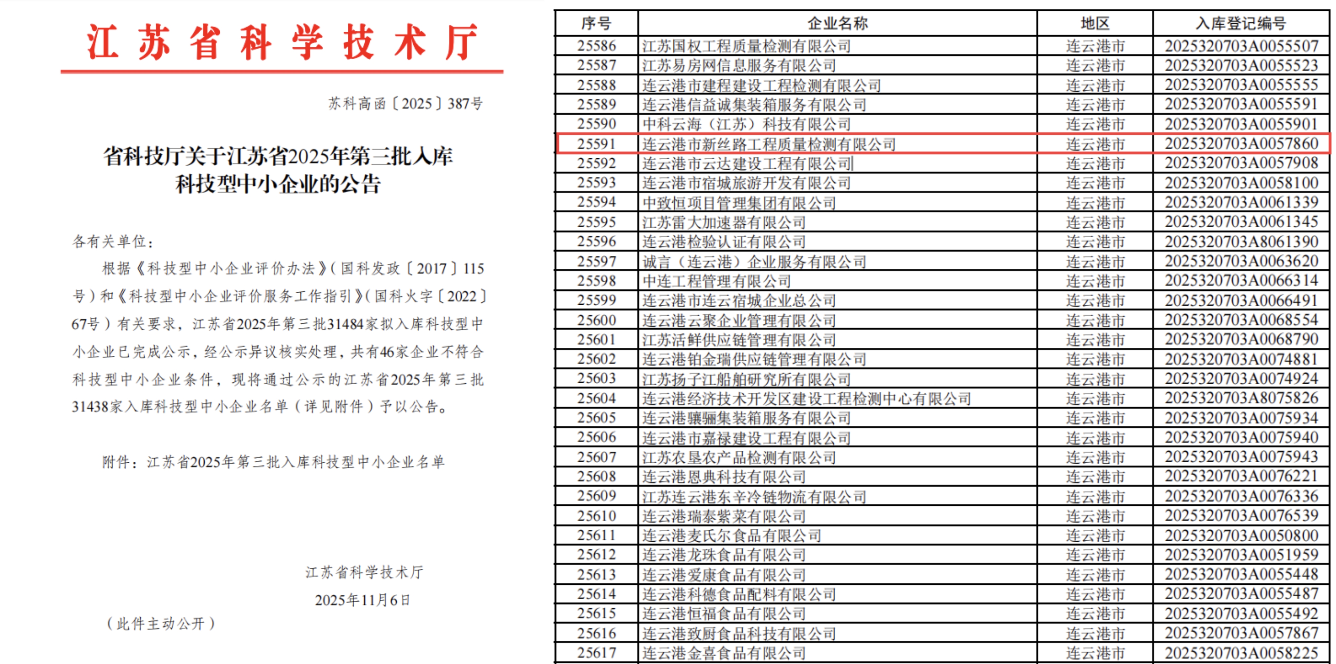 近日,江苏省科学技术厅公布2025年第三批科技型中小企业入库名单,江苏海建新丝路工程质量检测有限公司凭借其扎实的技术实力和持续的创新能力成功入选,正式获得江苏省科技型中小企业认证。