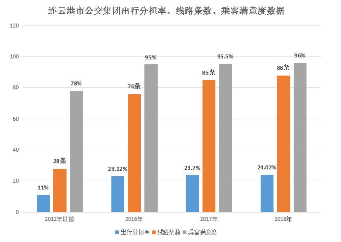 2012年之前,我市运营公交线路仅有28条,车辆数370台,社会承包车占比70%,车辆空调化率为23.7%,日均客流量为13.29万人次,出行分担率为11%,社会满意率仅为78%。经过六年精心耕作,公交发展指标得到大幅提升。