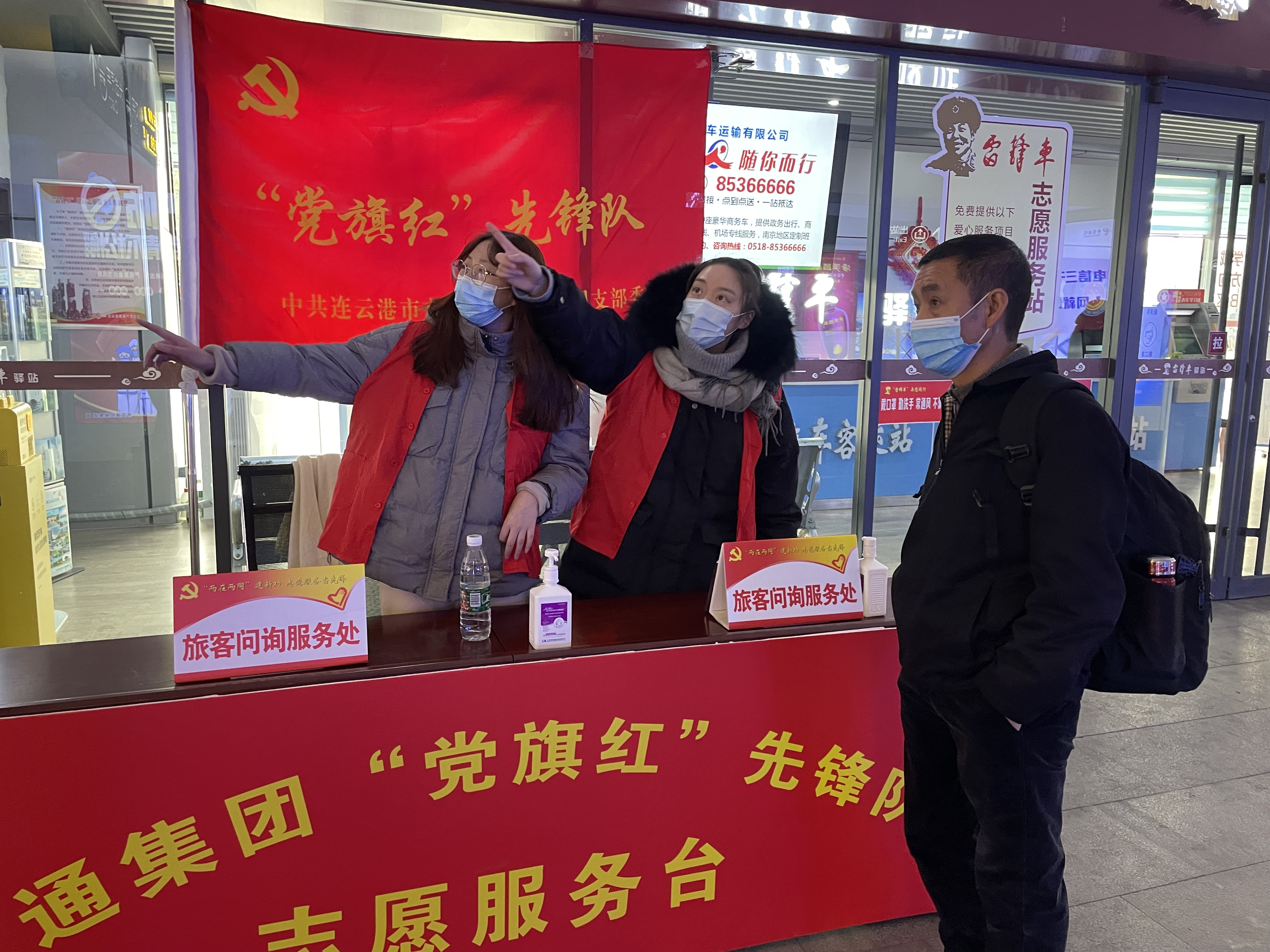 12月31日,元旦小长假出行小高峰开始,交通集团“党旗红”先锋队队员们早早守候在连云港综合客运枢纽,分散在出站口等人流量较大的位置,为出行旅客提供路线询问、解疑协助等志愿服务,同时为有需要的旅客提供口罩、消毒液等防疫物品。