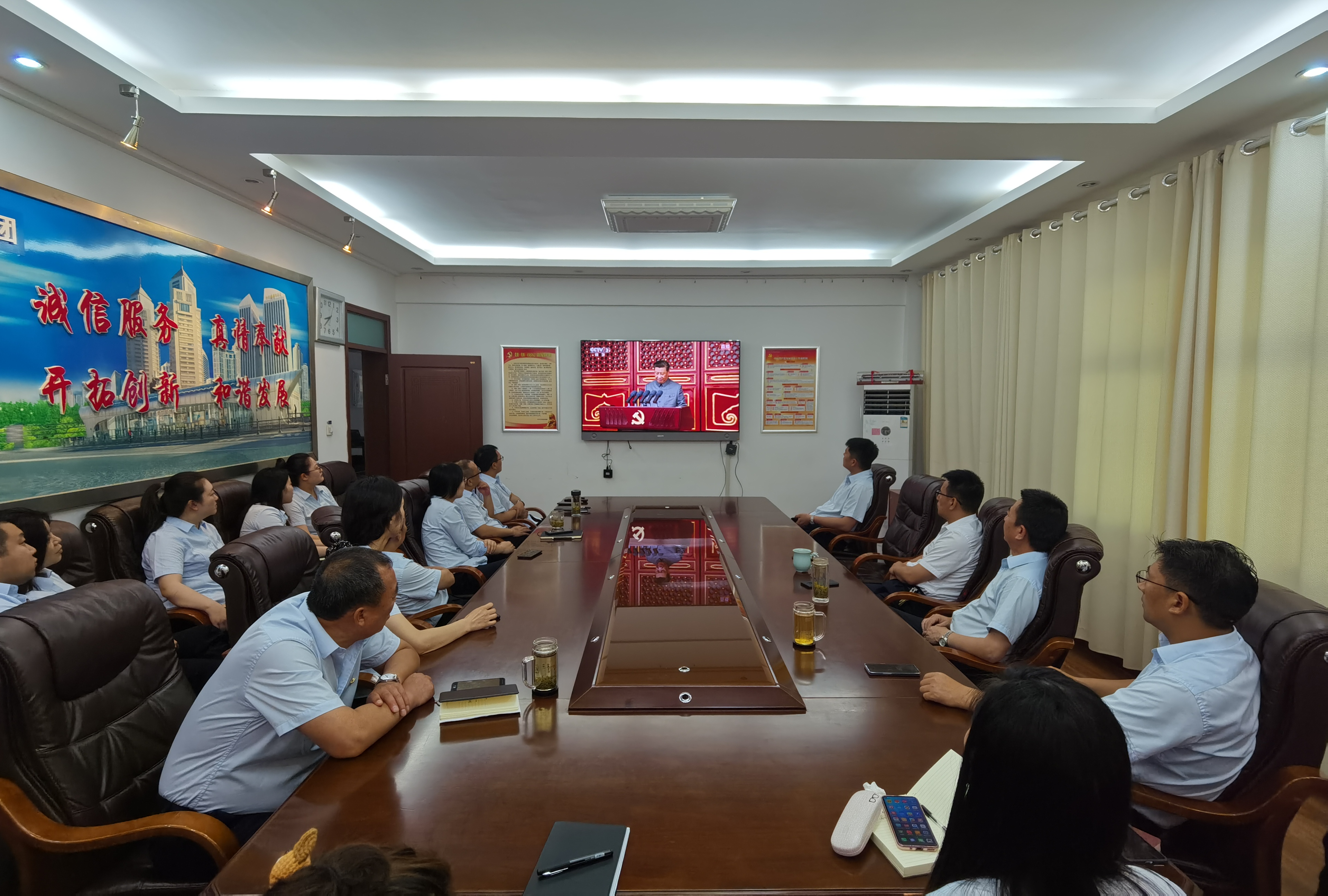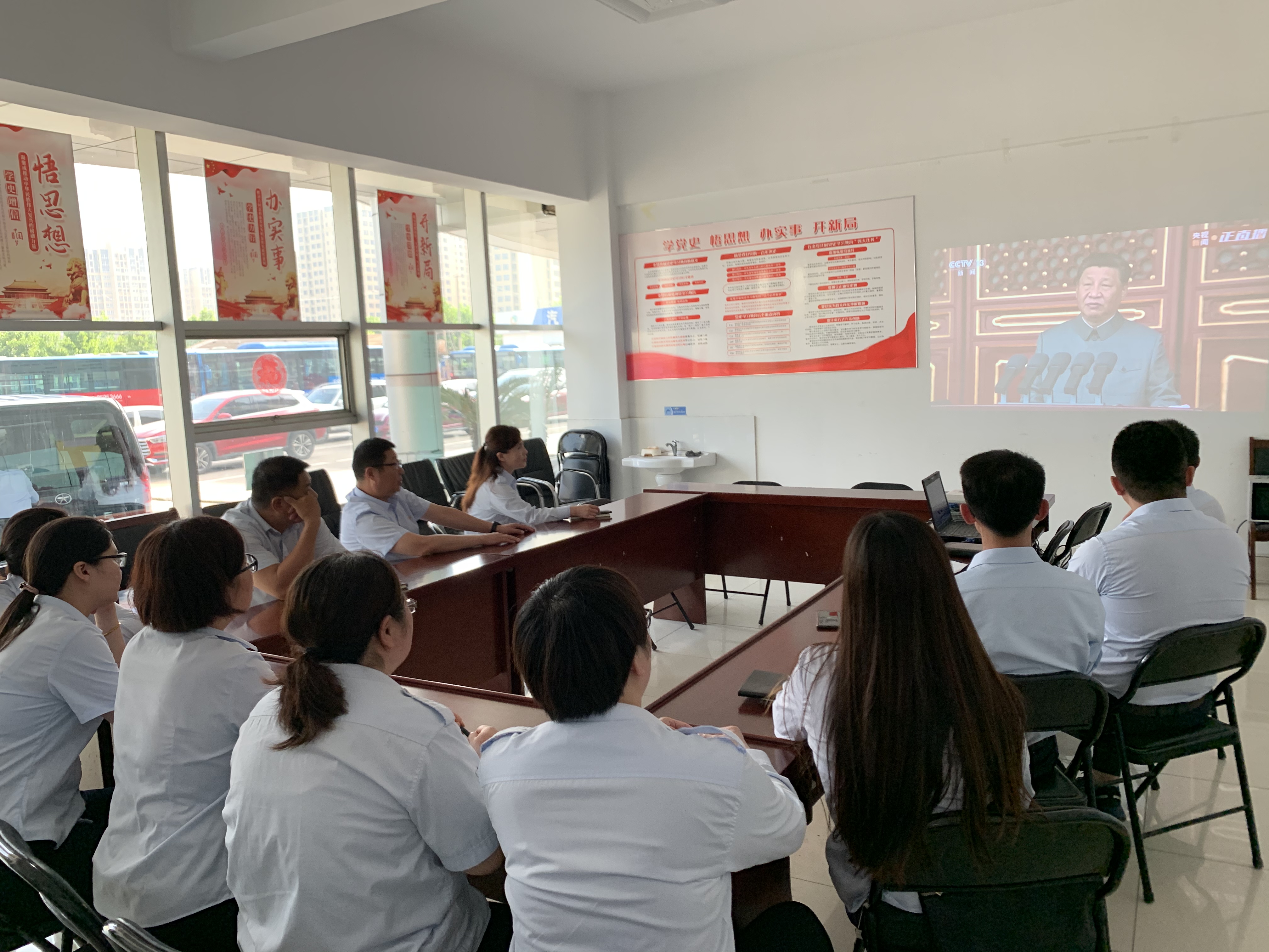 公交事业一部组织观看庆祝中国共产党成立100周年大会。以科室、分公司、班组为单位,分别以集中观看、班次间隙回放等方式,公司各岗位全面掀起了学习习近平总书记“七一”重要讲话精神。