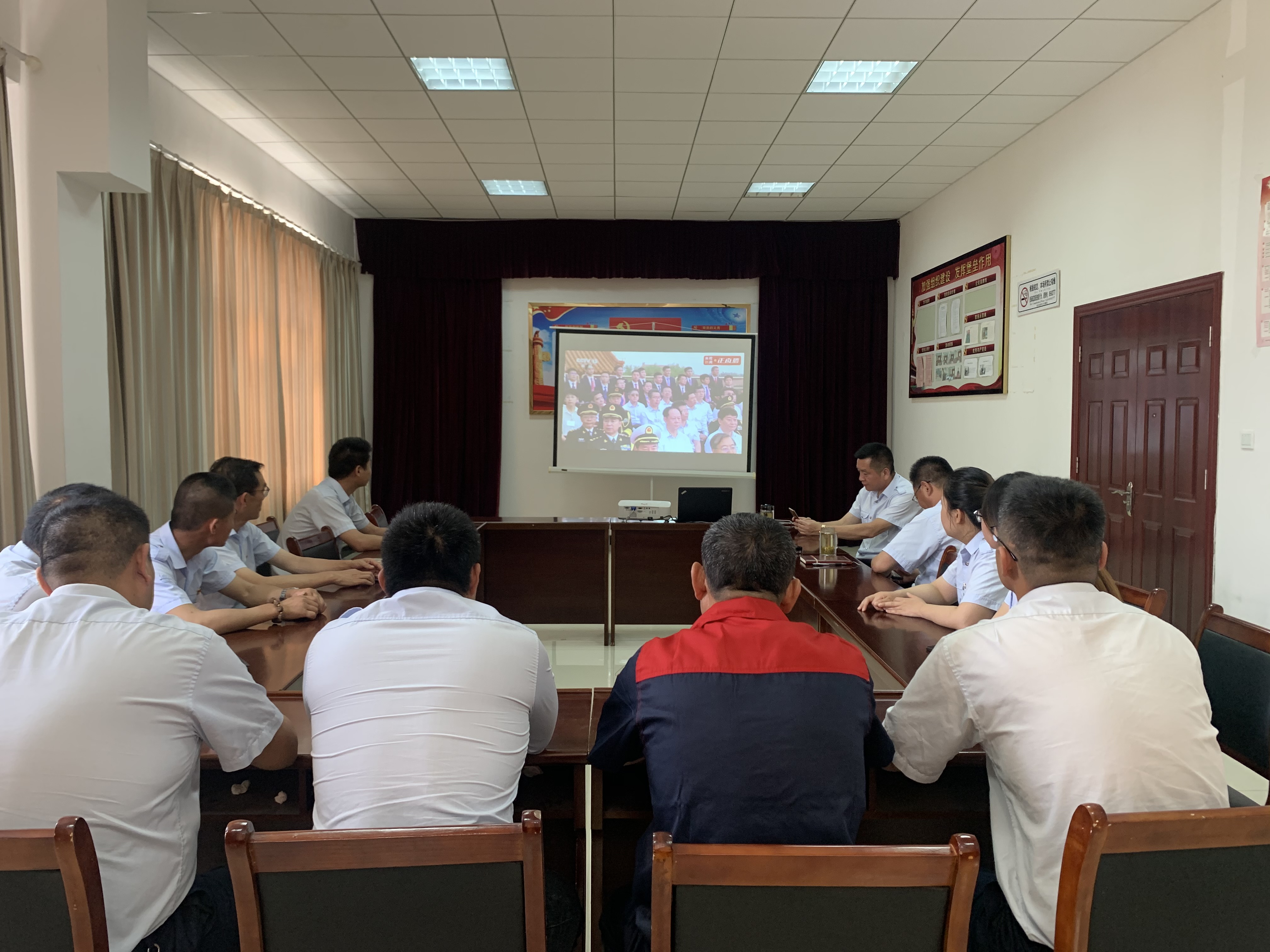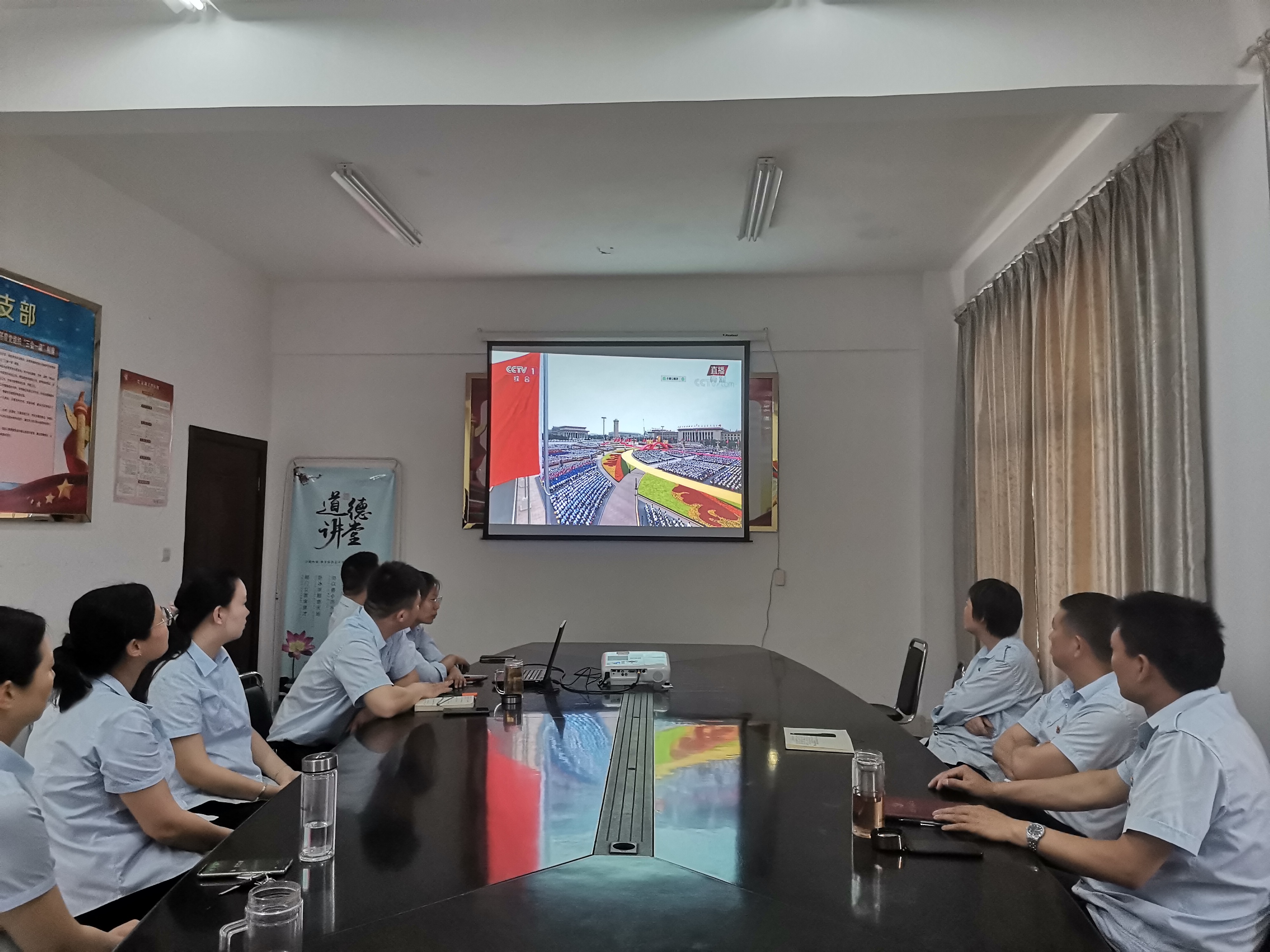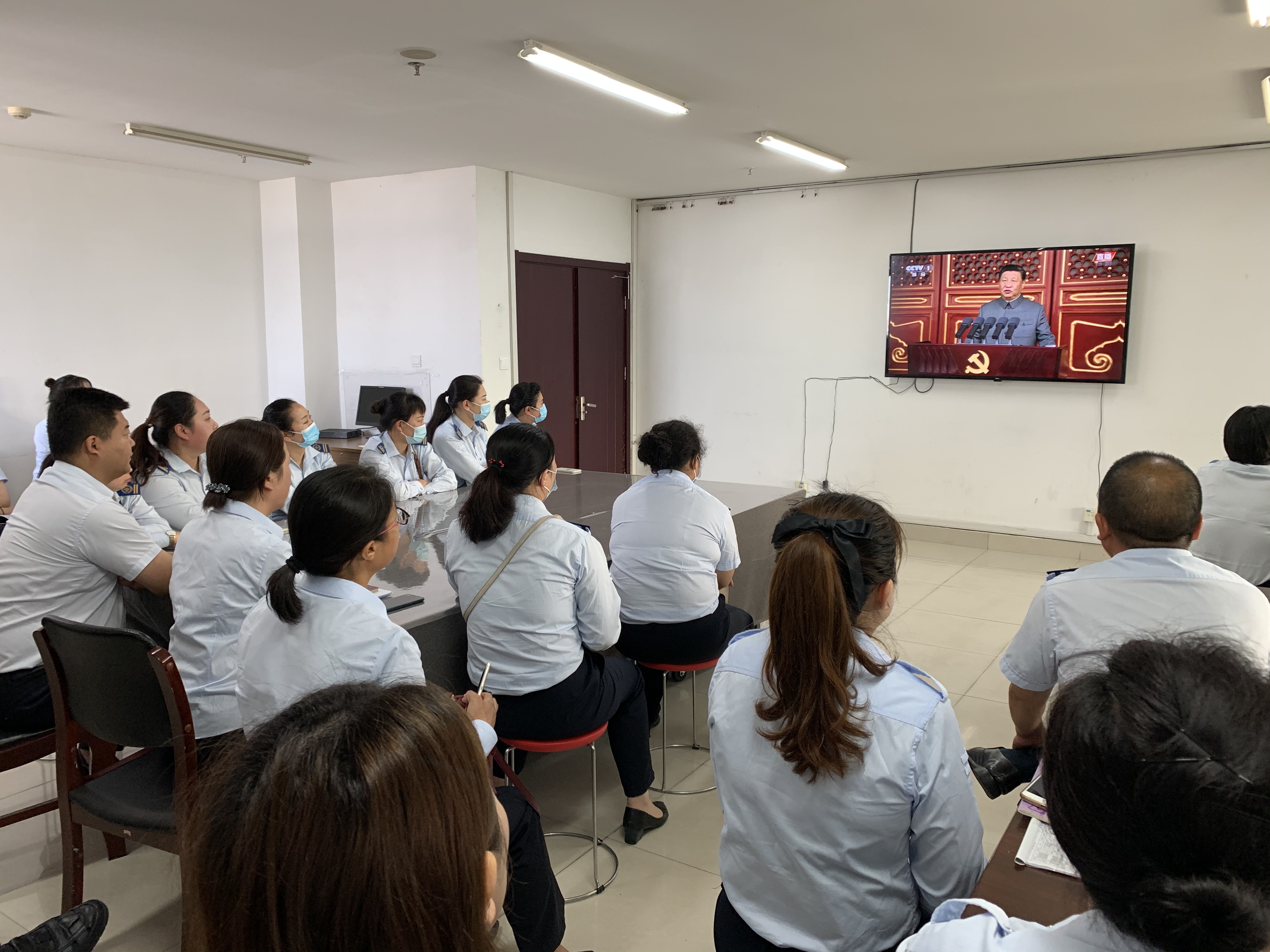 为庆祝中国共产党成立,公交集团机关支部组织机关全体党员、积极分子在二楼会议室集中收看庆祝中国共产党成立100周年大会全程直播实况。