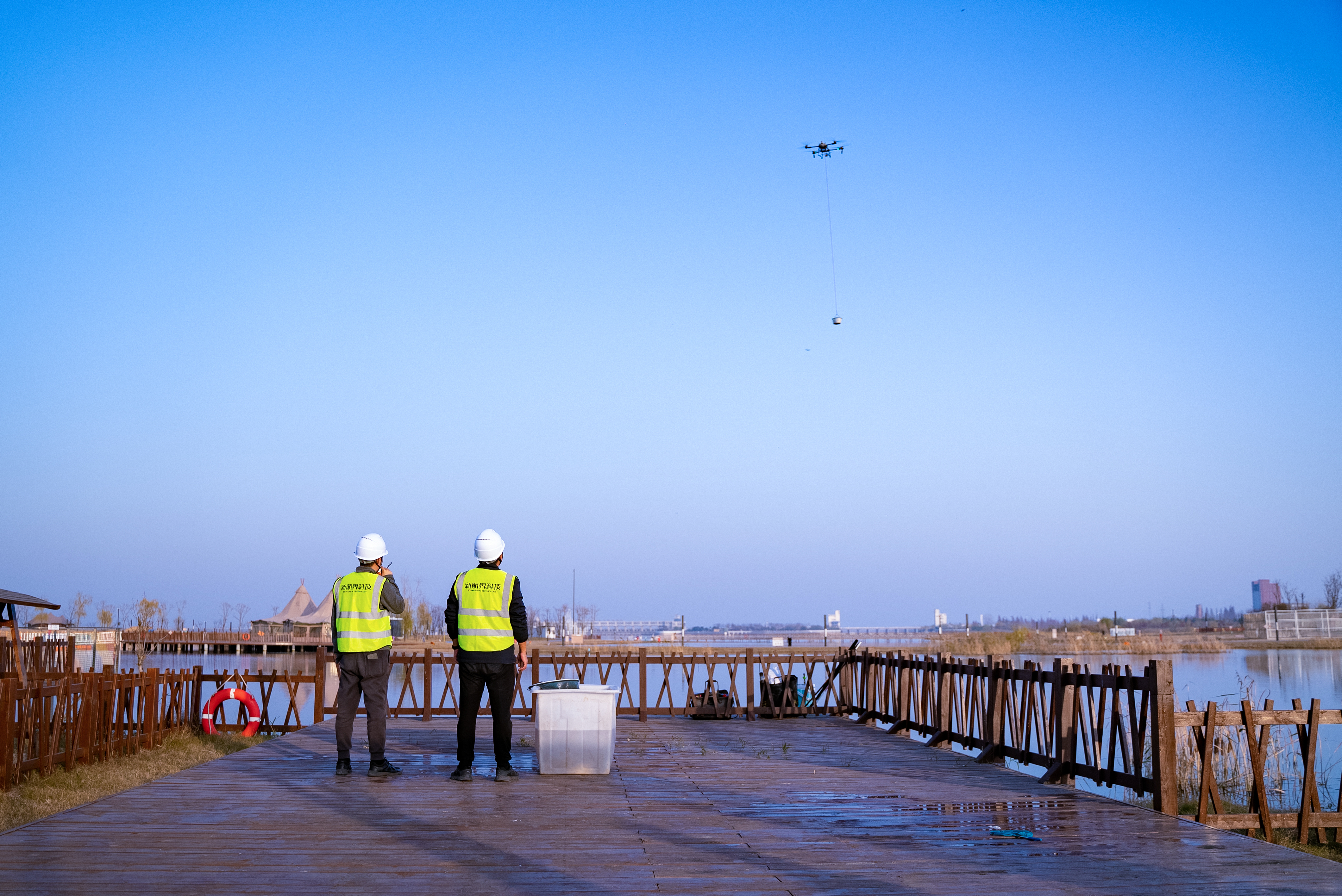 市航空运动协会基于其专业判断与行业经验,主动接洽库区作为无人机吊运技术试点场景,标志着继垂钓、摄影等协会后,库区的资源价值再度获得专业社会团体青睐。交通集团认可并承接该创意,依托协会的专业建议,配合提供场地支持与必要协调,并结合前期市场调研,以垂钓为基准点,创新性地将水陆空联动作为切入点,促成本次活动在库区的落地。双方经过安全规范、技术论证、机型优选、风力勘测、距离判断、载重试飞等多环节精密筹备,综合考量库区水陆地貌及低空遮挡情况,最终选定星光渔火营地作为无人机垂钓吊运达人培训场地,并同步开展协会相关团建活动。